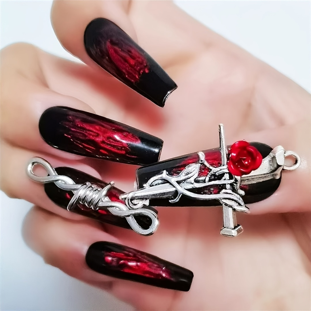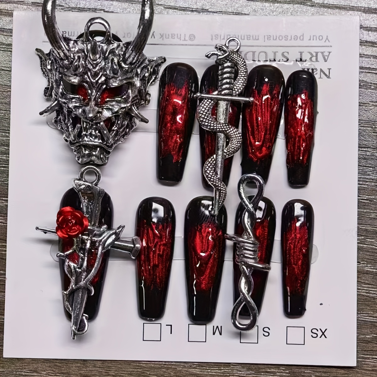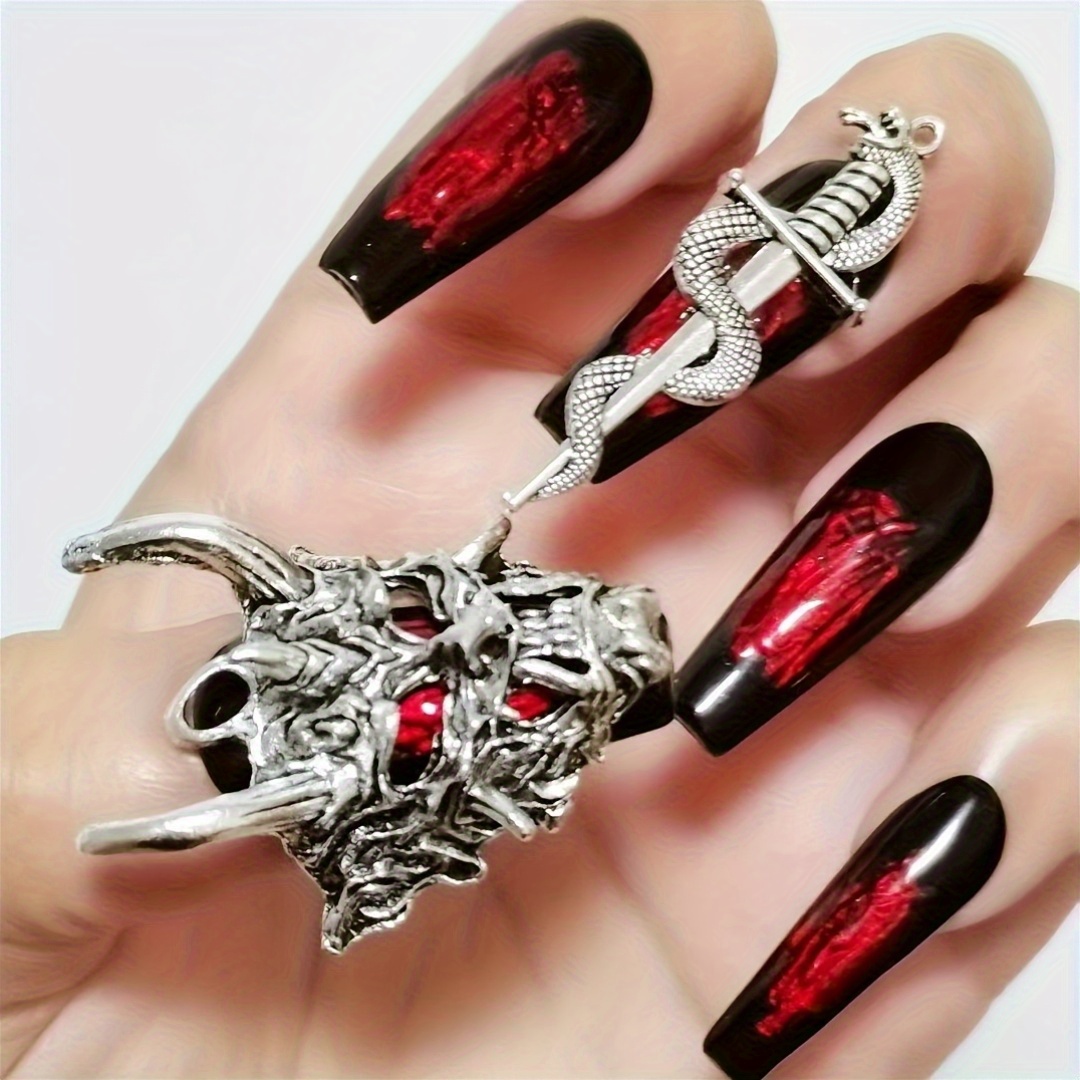Dagger roses. Coiled snakes. Demon head realness. This handcrafted press-on set is forged in fire—glossy black tips streaked with ruby red and armored in metallic charms that slay like sacred artifacts. Perfect for glam drops, cosplay shoots, or any moment you want to serve legend with lacquer. ✨ Gothic. Gilded. Game-changing. Add to cart and press on to power.