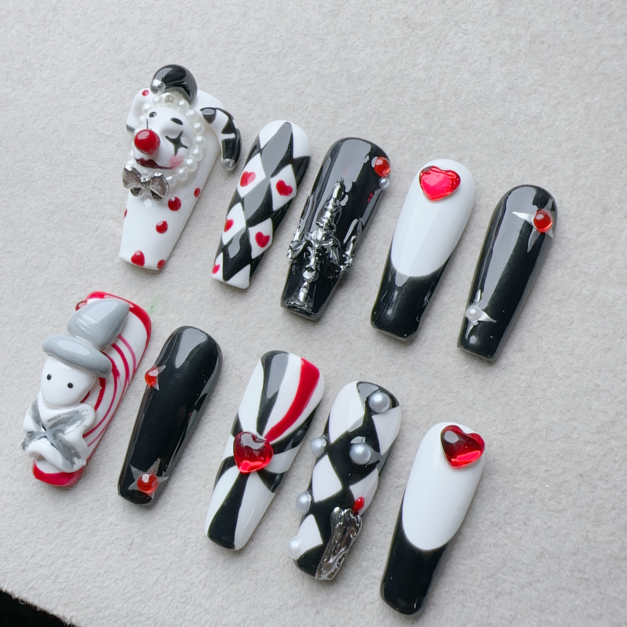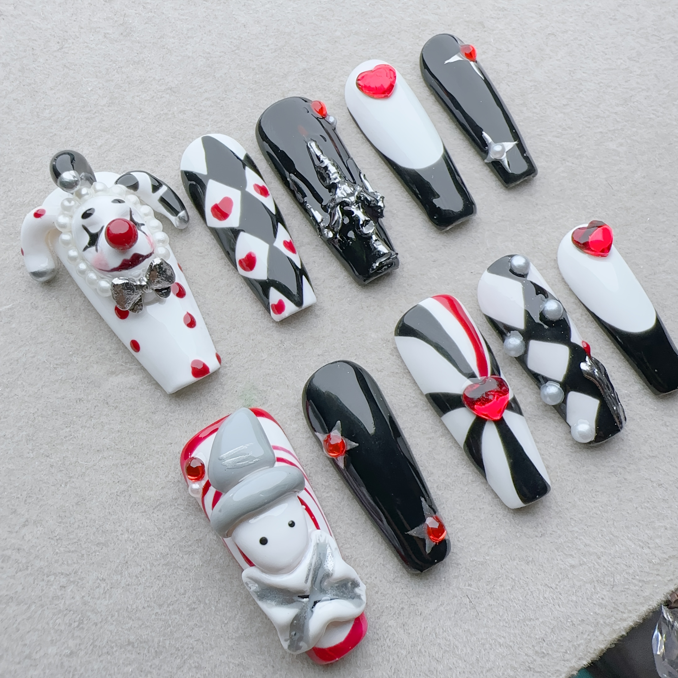 Jester. Joker. Jewel-studded. Leave the crowd starstruck with these daring showstoppers: Chic circus spirit emanates from every hand-painted detail. From candy cane stripes and harlequin diamonds to ghost charms and rhinestone hearts, this handcrafted set is pure performance art. Perfect for themed drops, editorial shoots, or any moment you want to serve sinister sophistication with sparkle. ✨ Bold. Theatrical. Unforgettable. Add to cart and step right up to the glam freak show.
