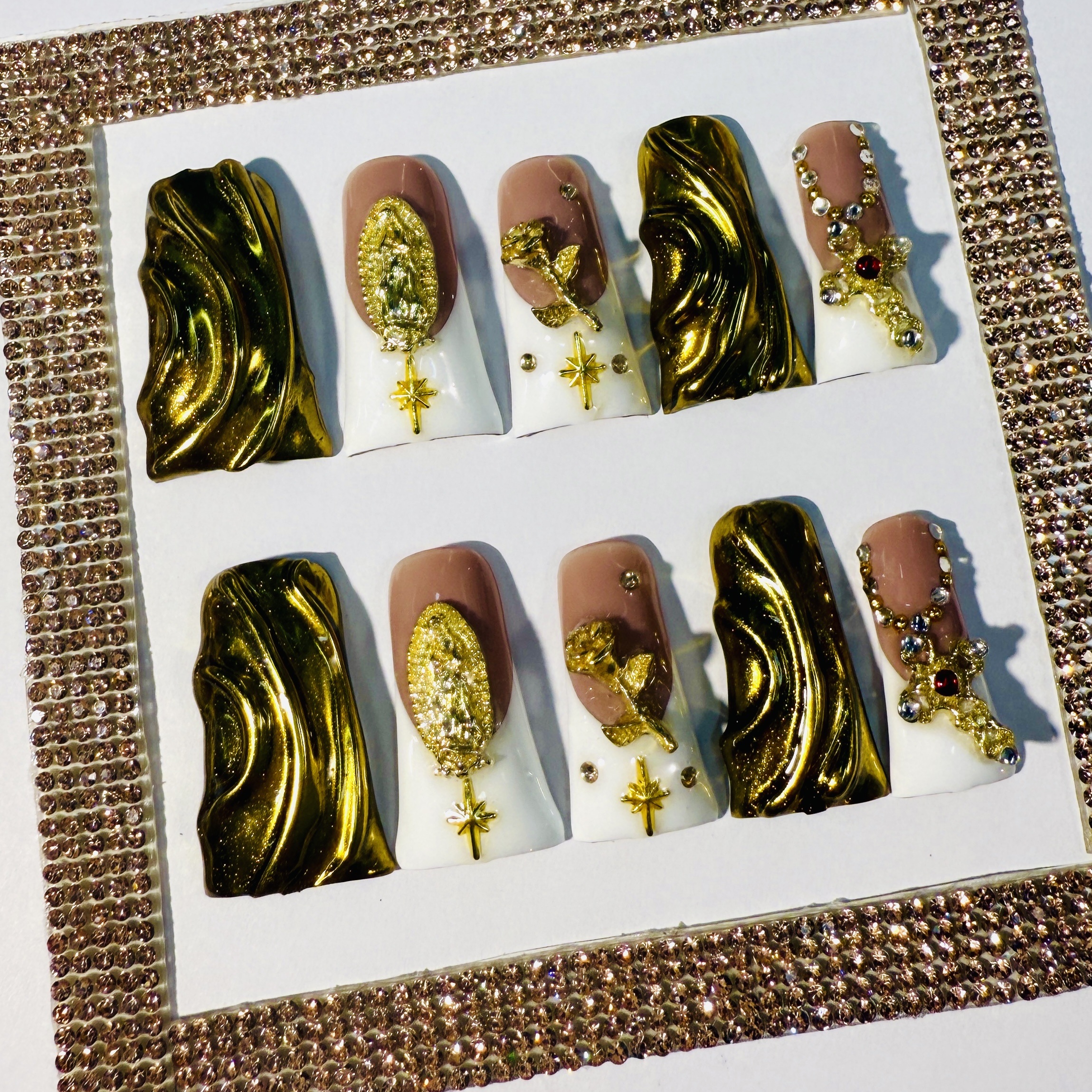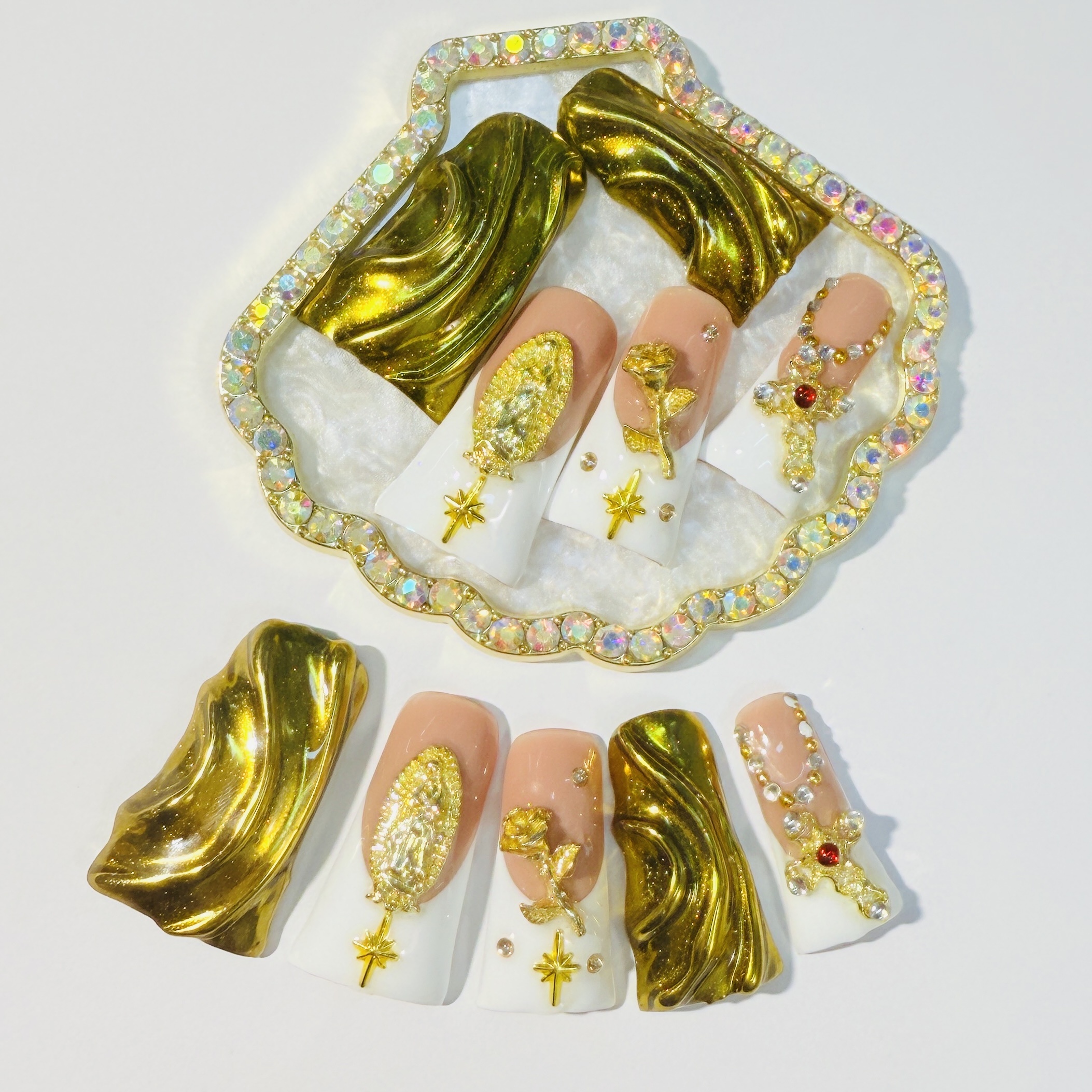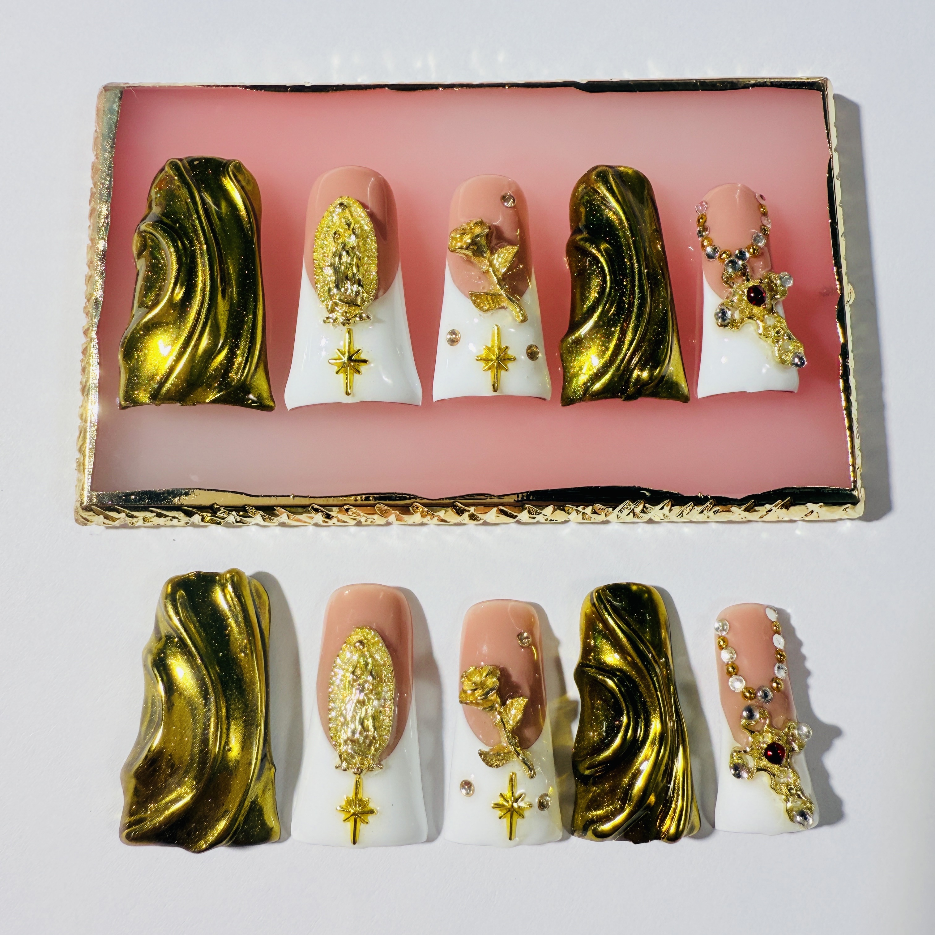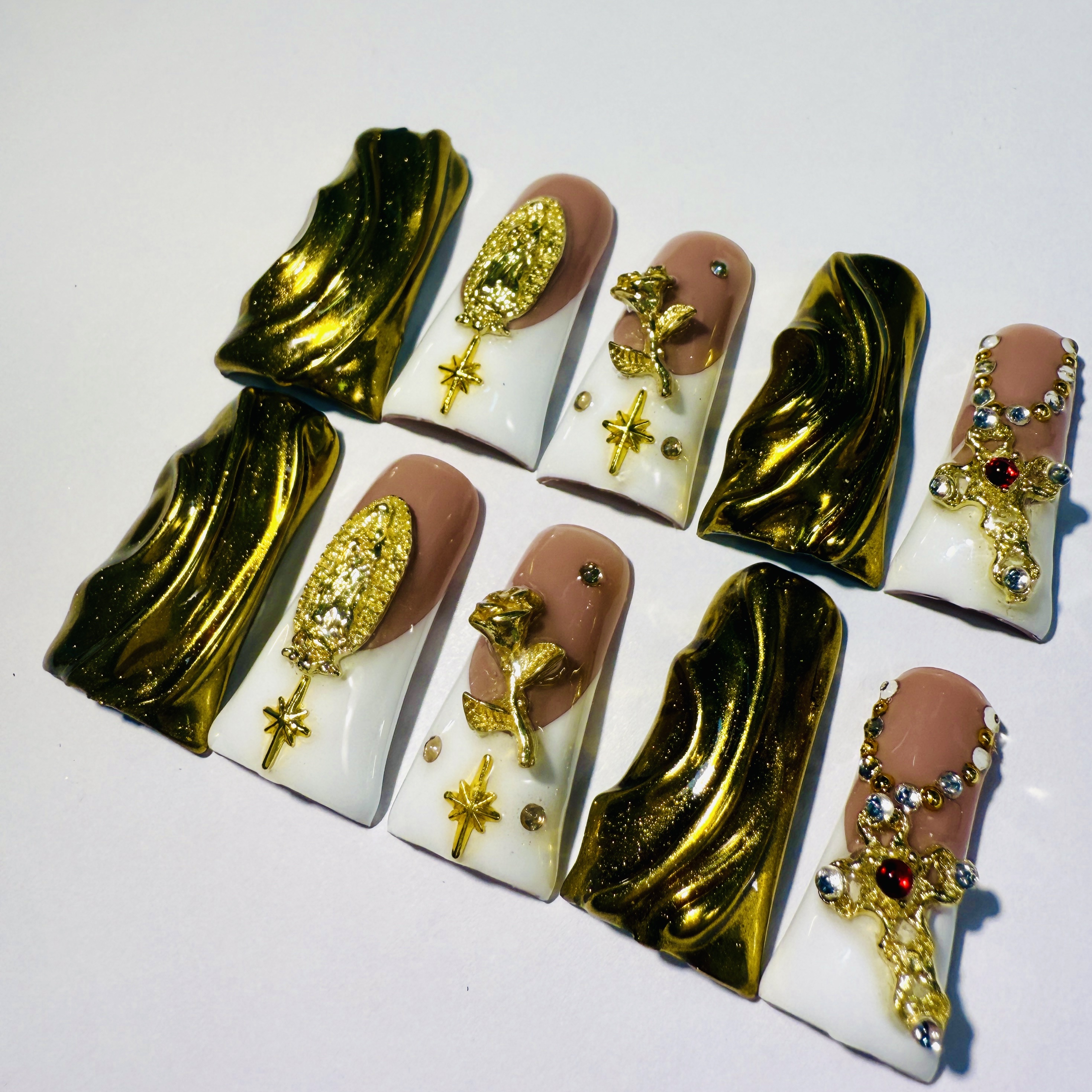 Rich. Reverent. Regal. This handcrafted acrylic set features ten ornate nails layered with gilded swirls, golden saints, rhinestone rosaries, and sculpted roses. Each nail is a sacred slay—blessed with iconography, dripping in devotion, and built to command attention. Perfect for fashion shoots, themed drops, or any moment you want to serve holy glam with high drama. ✨ Lightweight. Long-lasting. Luxe. Add to cart and command your crowd.