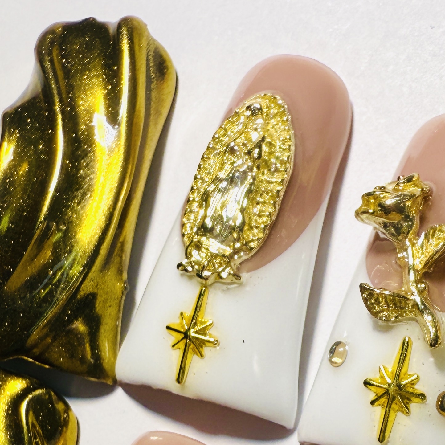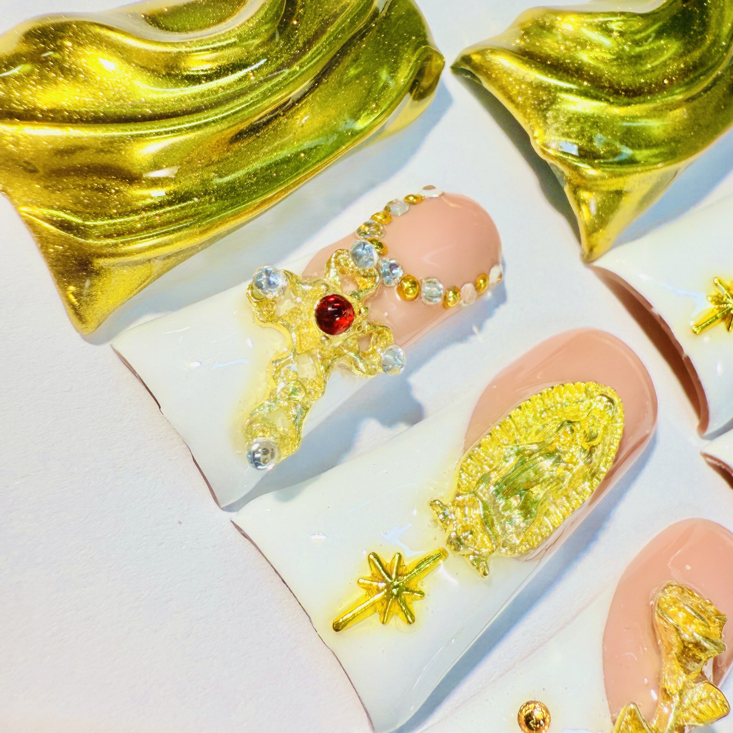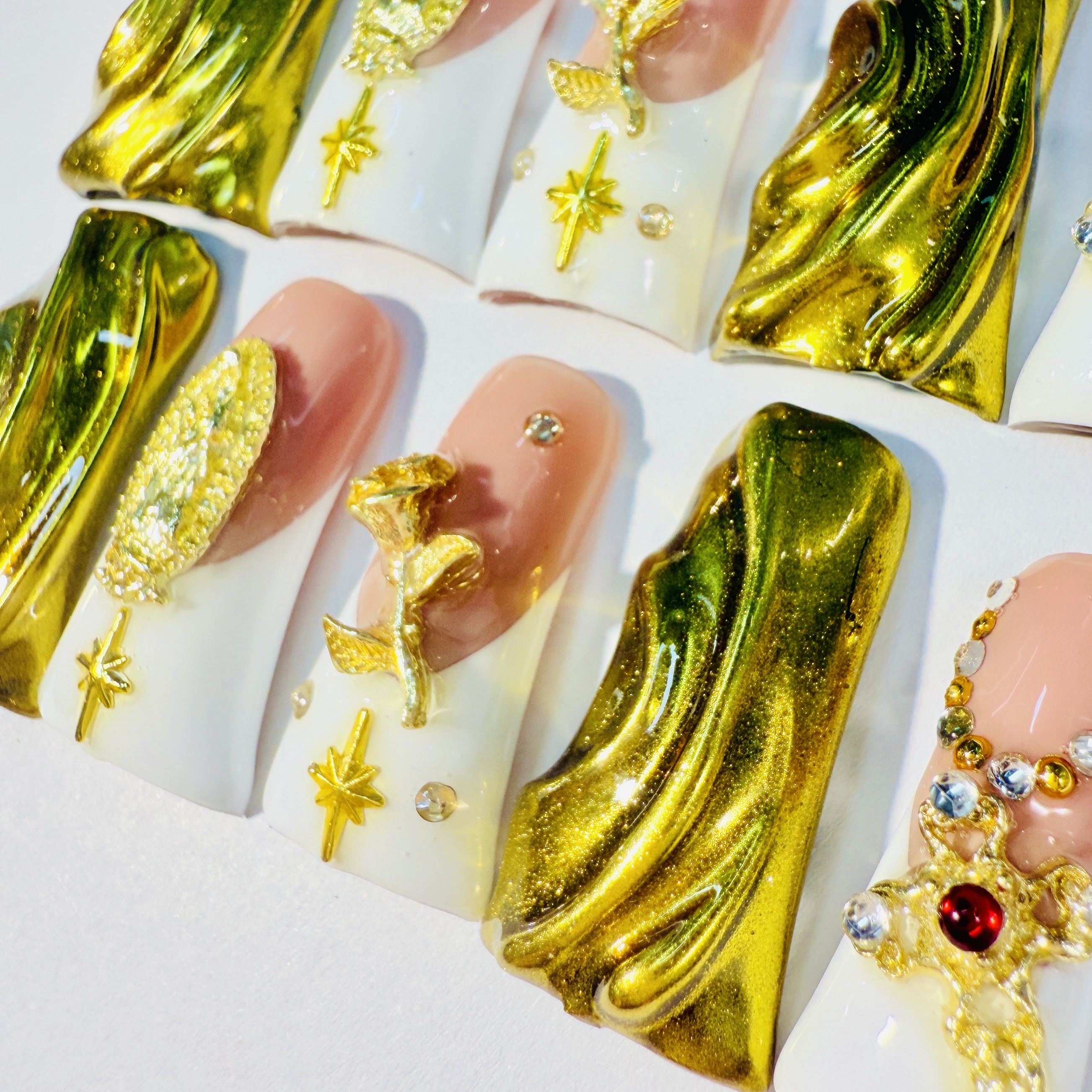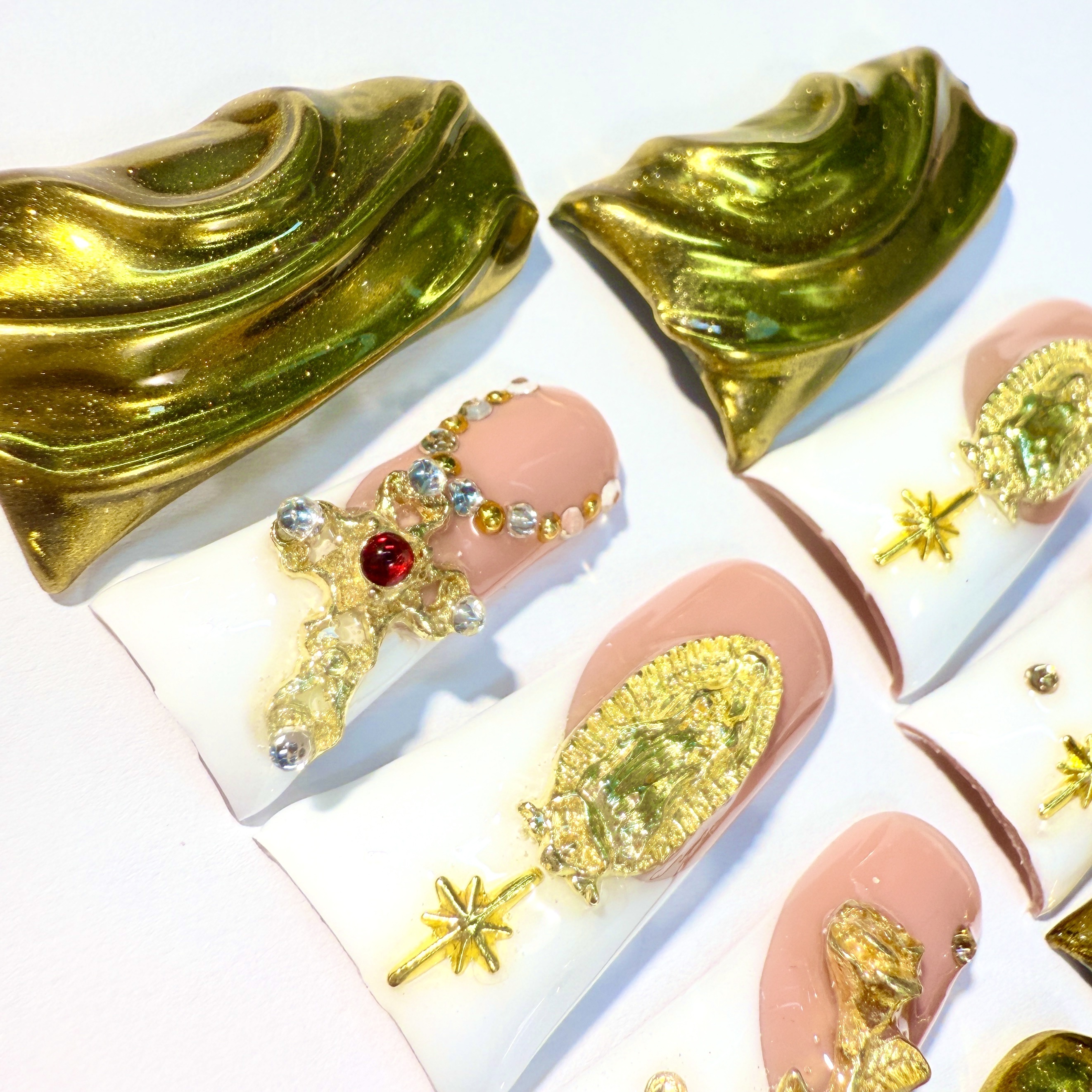Rich. Reverent. Regal. This handcrafted acrylic set features ten ornate nails layered with gilded swirls, golden saints, rhinestone rosaries, and sculpted roses. Each nail is a sacred slay—blessed with iconography, dripping in devotion, and built to command attention. Perfect for fashion shoots, themed drops, or any moment you want to serve holy glam with high drama. ✨ Lightweight. Long-lasting. Luxe. Add to cart and command your crowd.