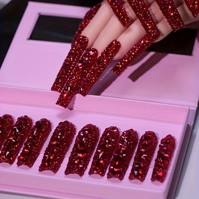 Loud. Luxe. Legendary. This handcrafted acrylic set features ultra-long rectangular nails drenched in red rhinestones for a textured, high-shine finish that commands attention. Every nail is a statement—bold, sculptural, and dripping in glam. Perfect for photo shoots, performances, or any moment you want to dominate the room. ✨ Lightweight. Long-lasting. Limitless slay. Add to cart and reign in red.