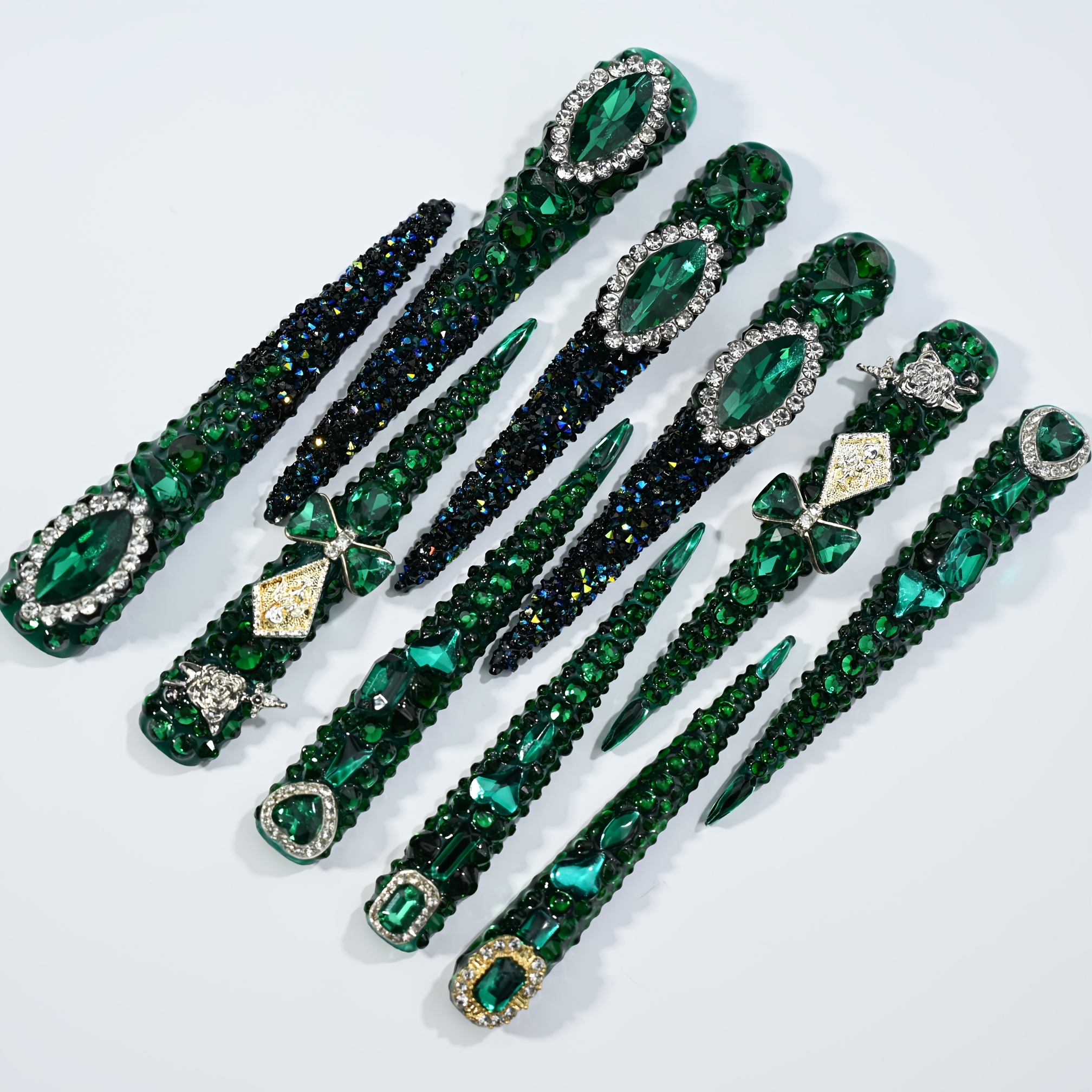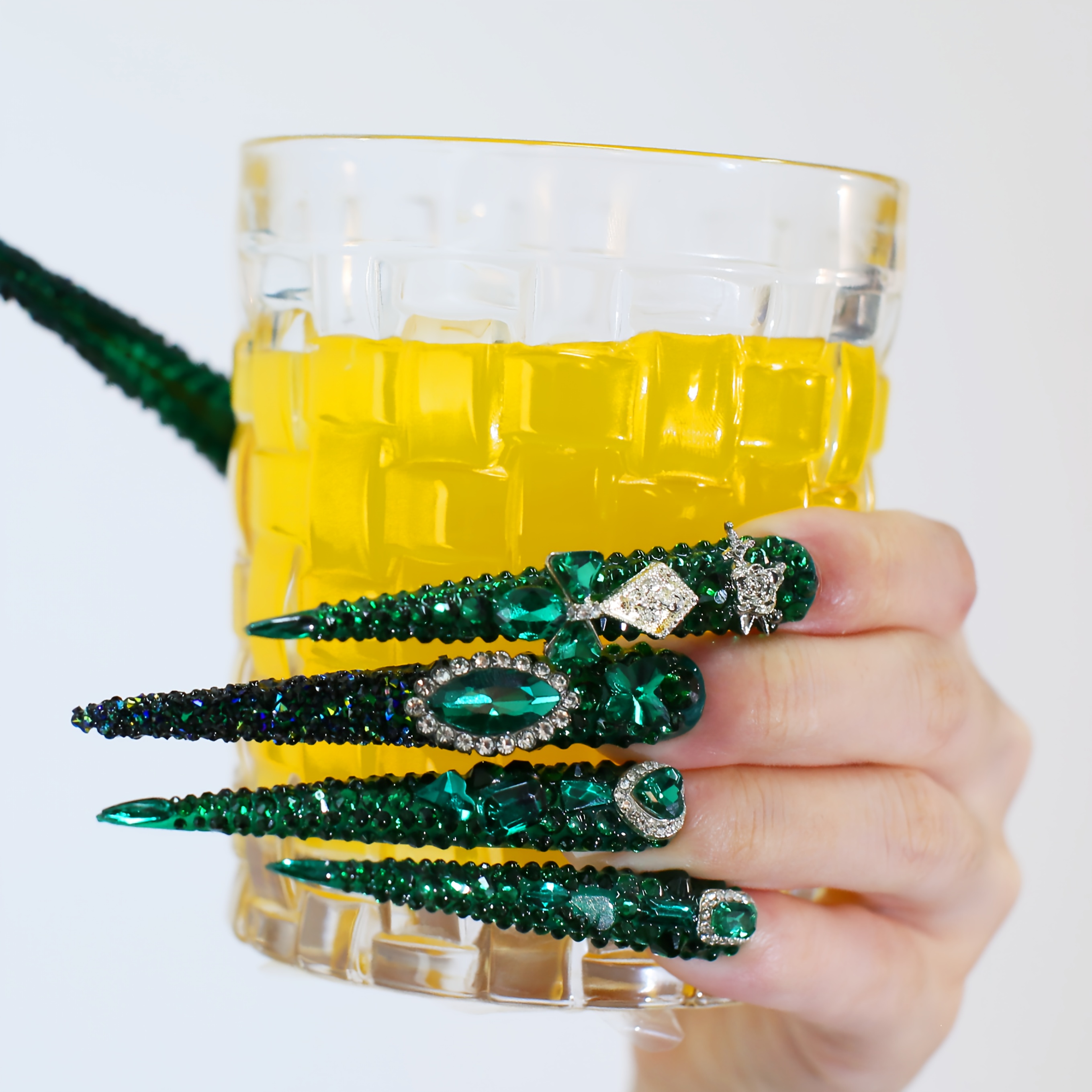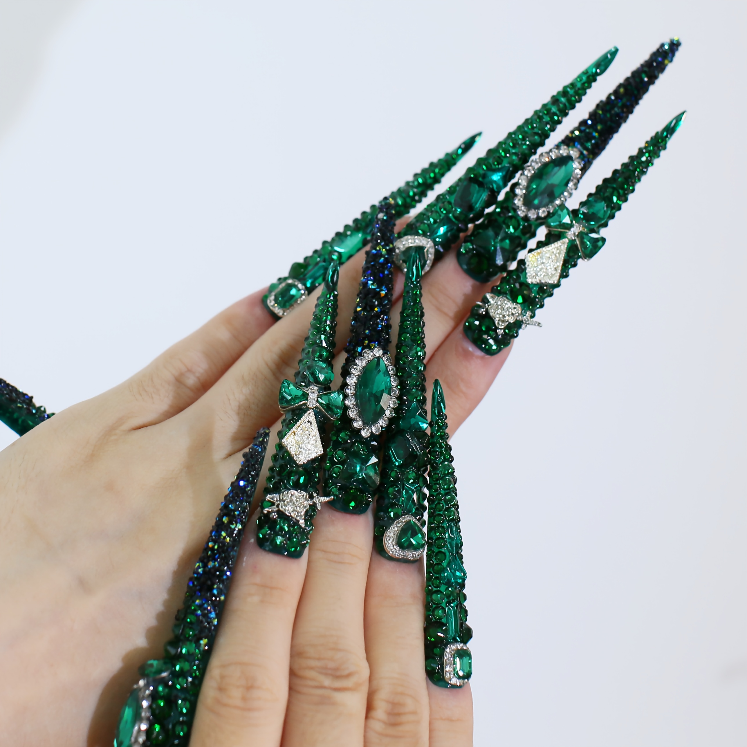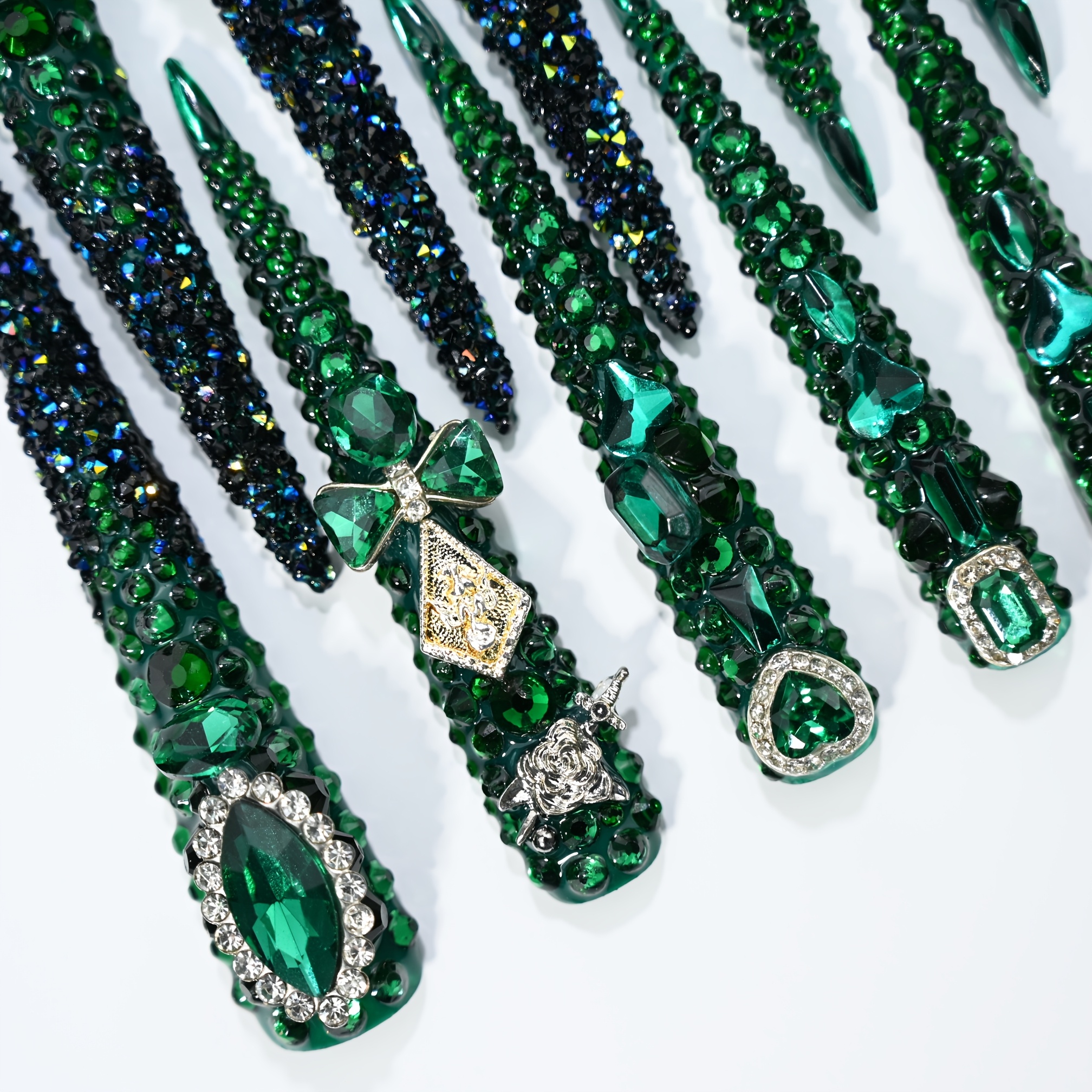 Sharp. Spellbinding. Sculpted to stun. This handcrafted acrylic set features ultra-long stiletto nails encrusted with emerald gemstones, silver rhinestones, and cosmic accents—from diamond-shaped charms to crescent moons. Each nail is a blade of beauty—ornate, opulent, and unapologetically extra. Perfect for glam shoots, red carpet entrances, or any moment you want to serve witchy wealth with edge. ✨ Lightweight. Long-lasting. Lavish. Add to cart and sharpen your silhouette.