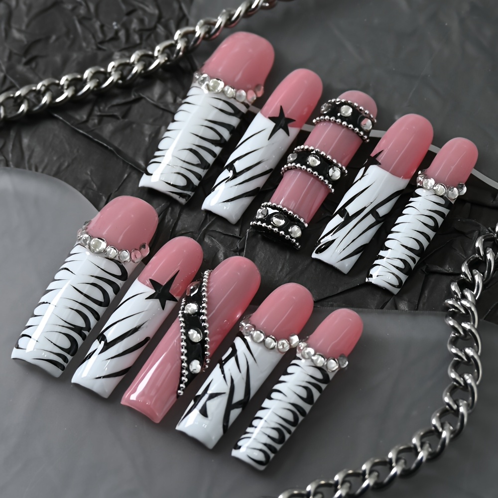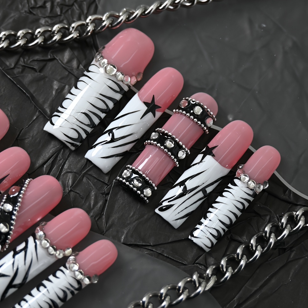 Feminine. Fierce. Fashion-forward. Pink kisses a classic black-and-white flame design on these handcrafted acrylic extensions. Sparkling stars and silver rhinestones mean this assertive set passes the vibe check for all the right reasons. Perfect for glam drops, concert nights, or any moment you want to serve soft chaos with a rhinestone halo. ✨ Dazzling. Durable. Daring. Add to cart and glam grips will give good glimmers.