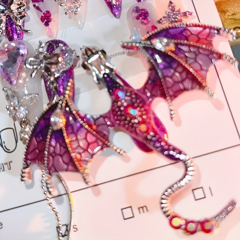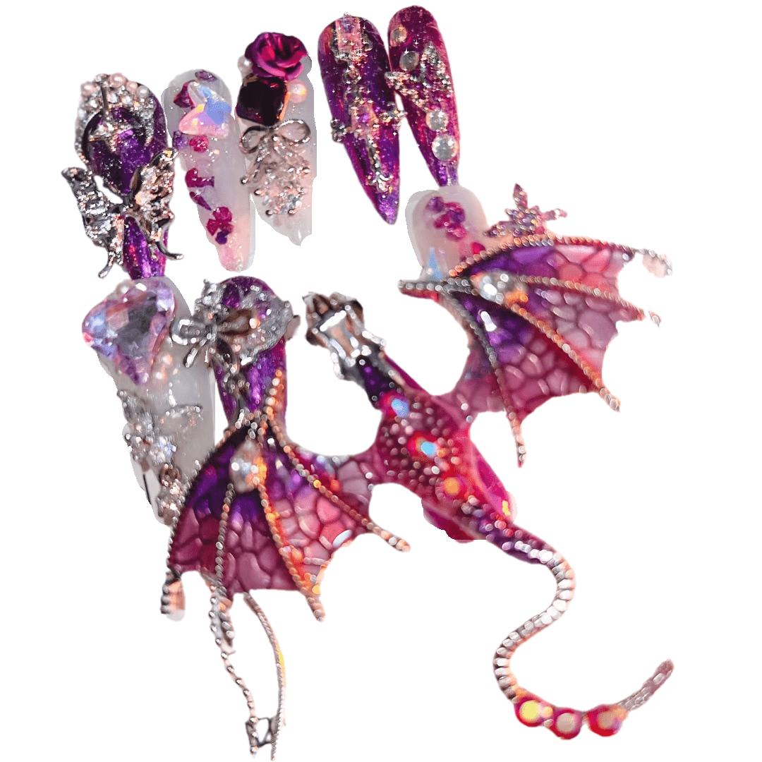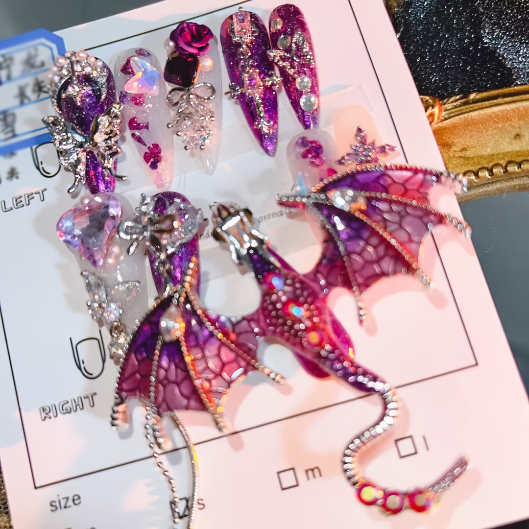 Winged. Pink-beryl. Stained glass slay. This handcrafted charm set features iridescent dragons with mosaic wings, curled tails, and crystal-studded bodies—paired with glitter-drenched nails and floral accents for full fantasy impact. Perfect for glam drops, cosplay kits, or any moment you want to serve myth with manicure. ✨ Mystical. Metallic. Museum-worthy. Add to cart and press on to power.
