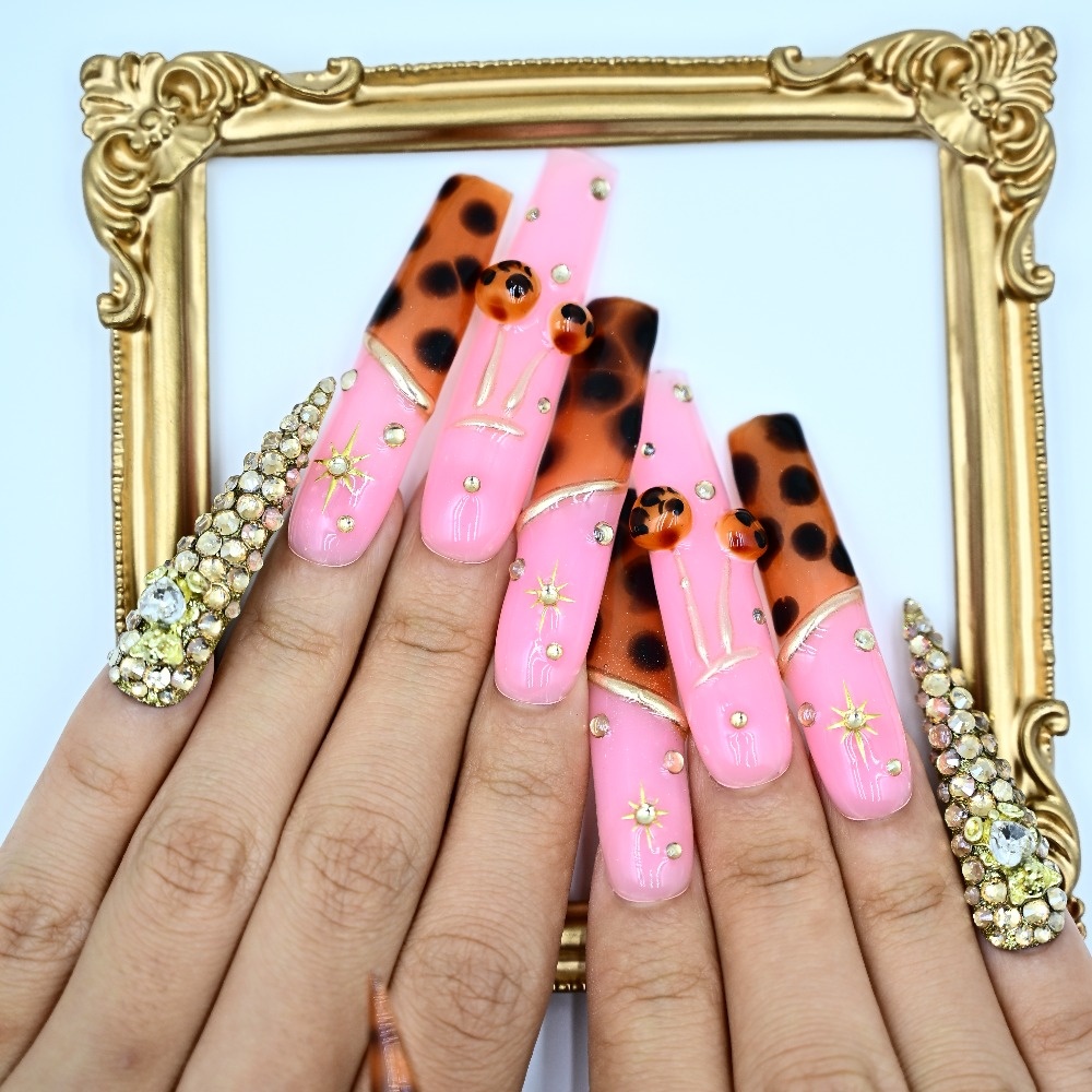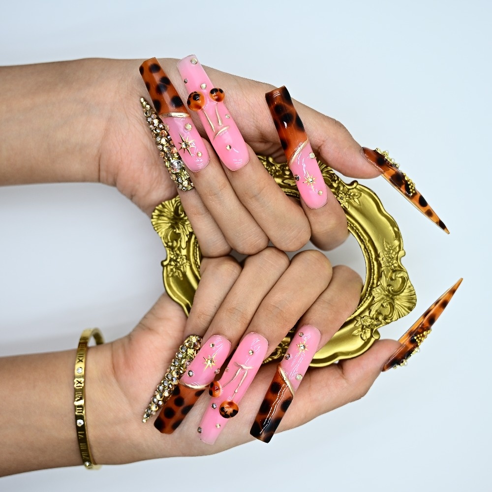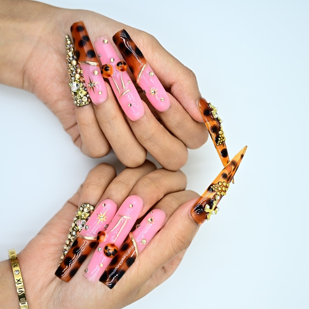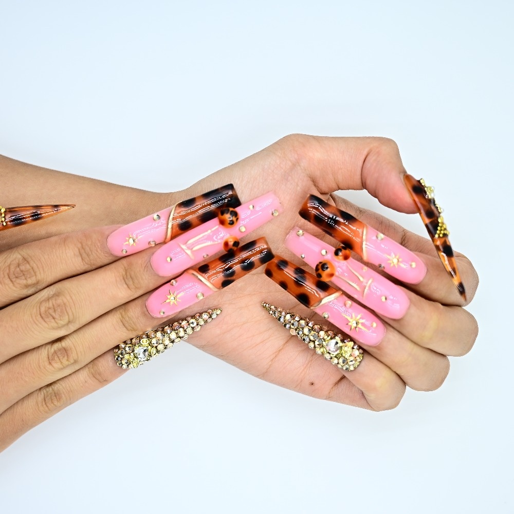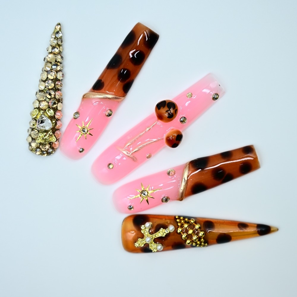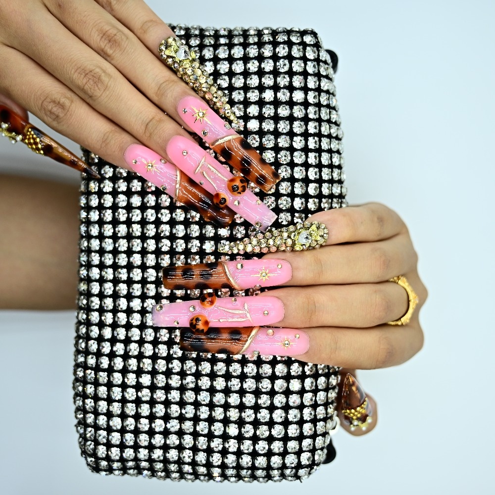 Pink vibes. Tortoiseshell heat. Gold crosses & sparkling jewels. This handcrafted stiletto set blends glossy bubblegum glam with warm tortoiseshell tones, layered in rhinestones and divine gold details. Perfect for glam drops, Sunday slay, or any moment you want to serve faith with fierce. ✨ Sharp. Sacred. Show-stopping. Add to cart and save your nail glam now.