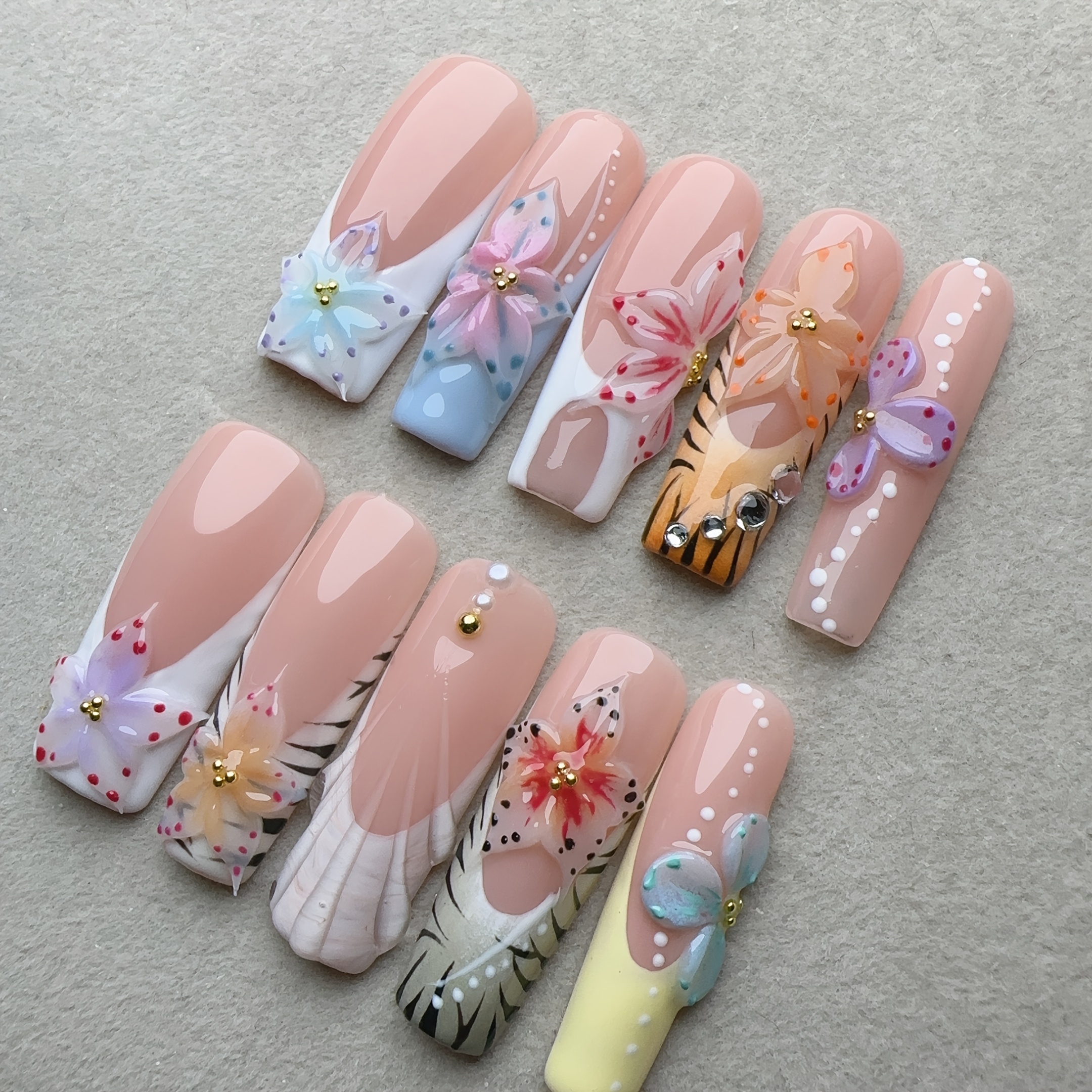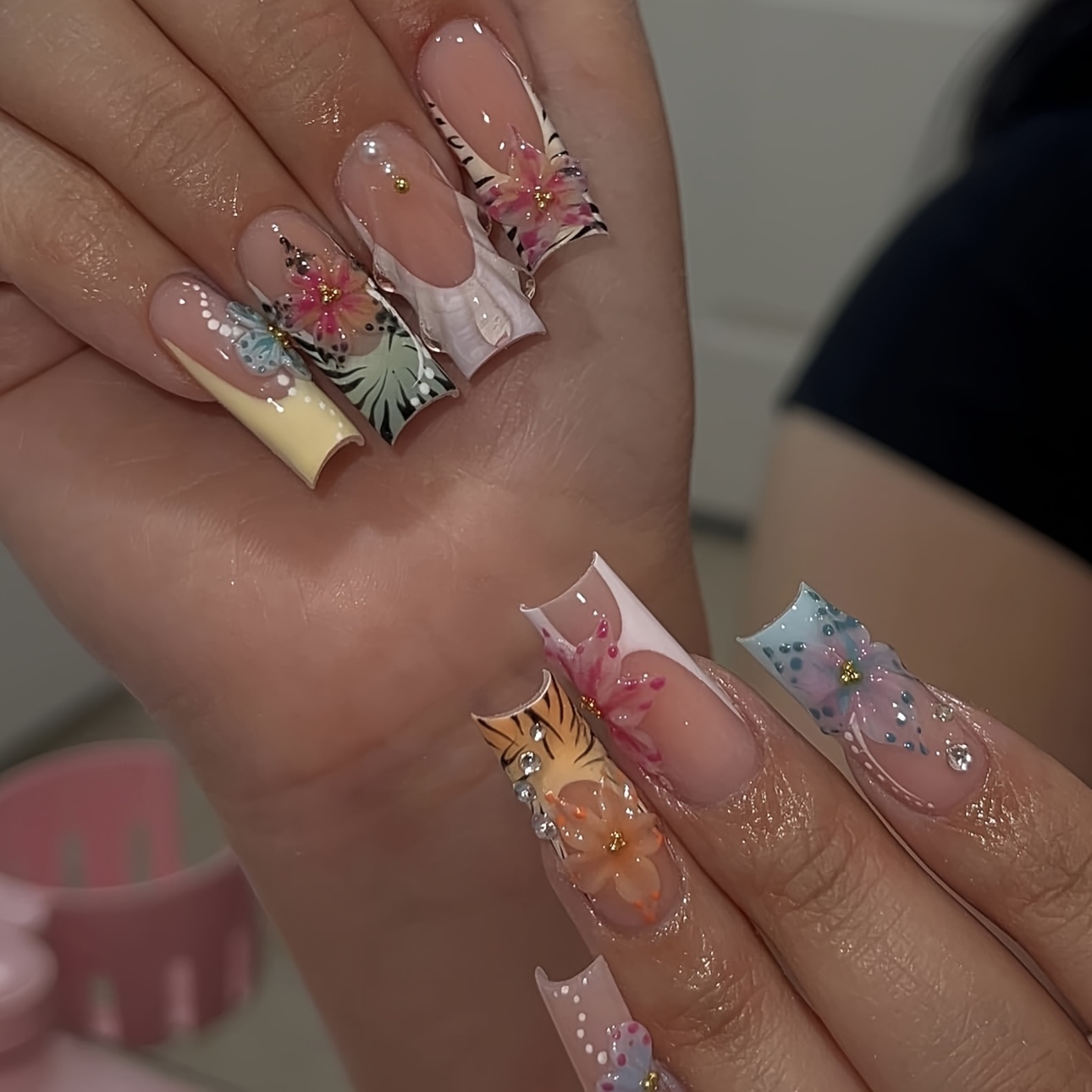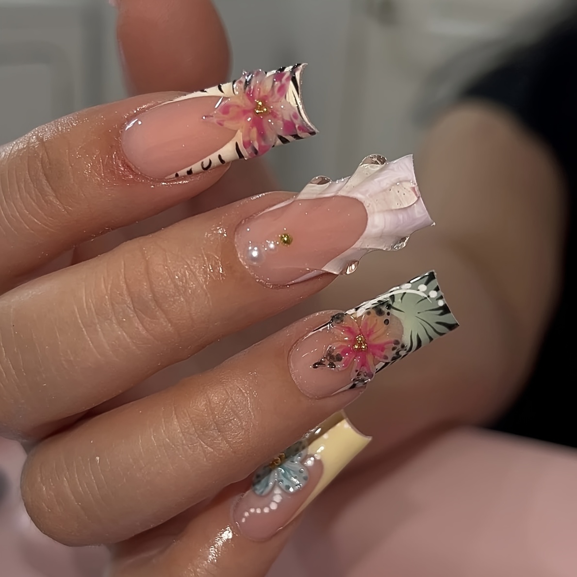 Floral. Fresh. Fiercely feminine. This handcrafted acrylic set features long coffin nails in soft pastel tones, adorned with tropical blooms, leafy accents, and crystal embellishments that sparkle like morning dew. Each nail is a petal-perfect masterpiece—painted to stun, sculpted to slay, and built for beauty in full bloom. Perfect for spring drops, resort shoots, or any moment you want to serve garden goddess glam. ✨ Lightweight. Long-lasting. Luxe. Add to cart and let your fingertips blossom.