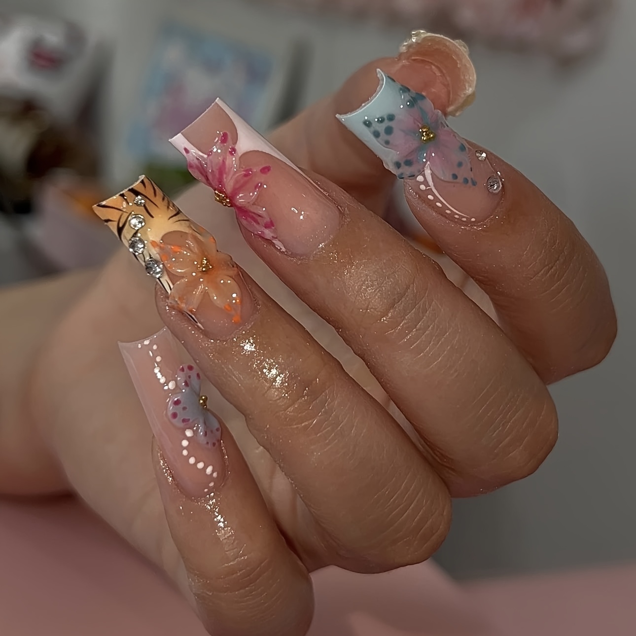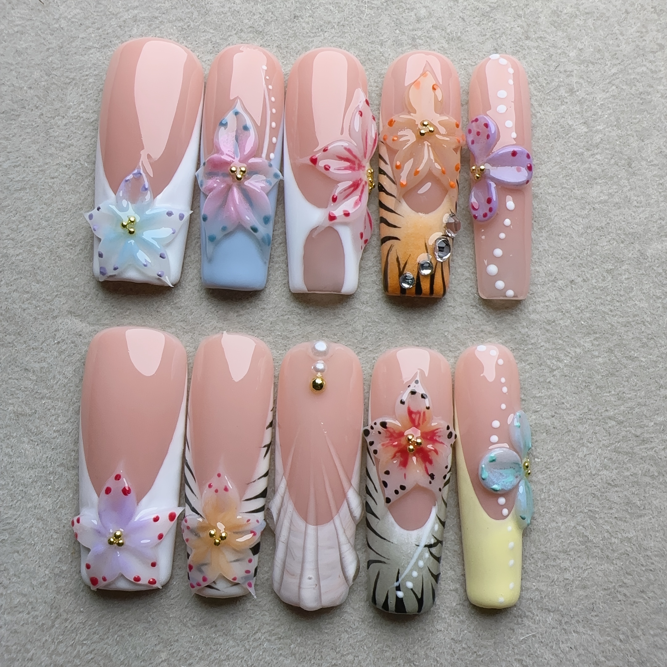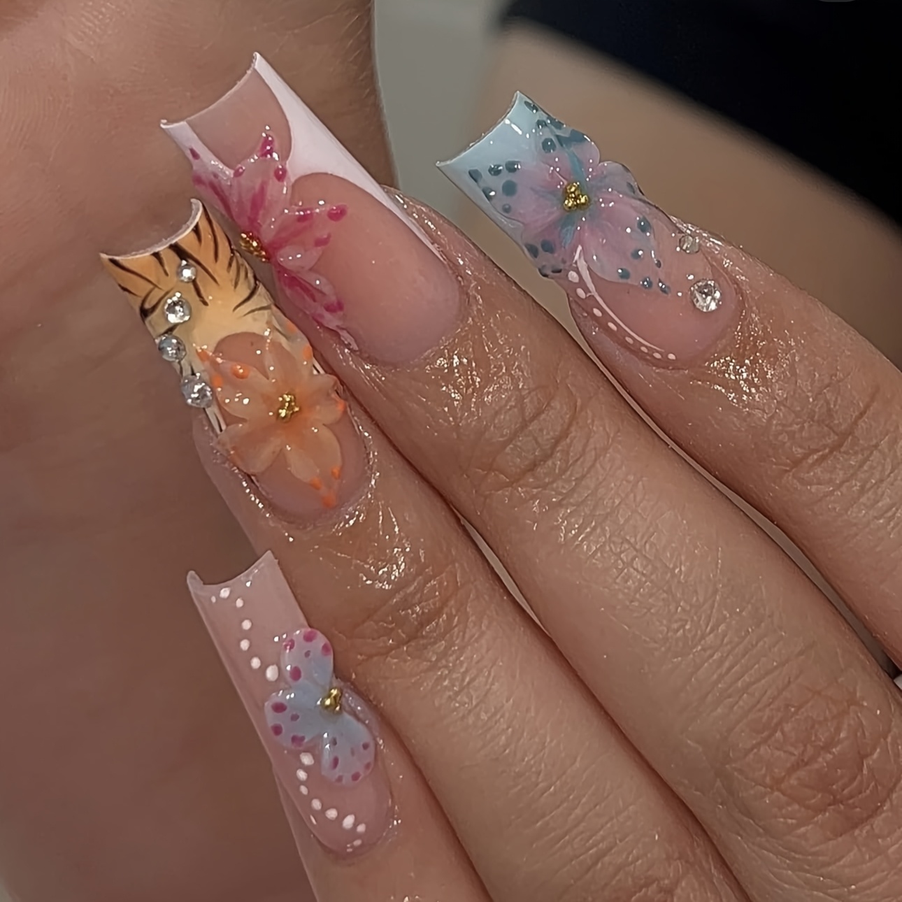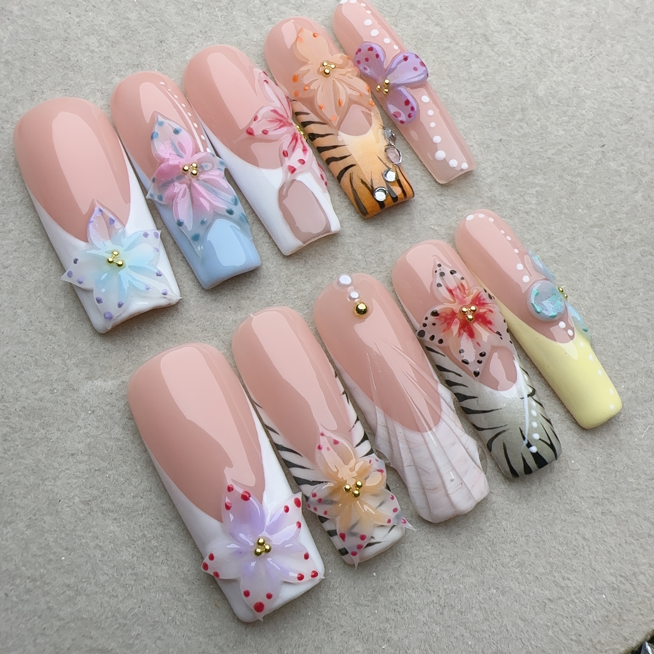 Floral. Fresh. Fiercely feminine. This handcrafted acrylic set features long coffin nails in soft pastel tones, adorned with tropical blooms, leafy accents, and crystal embellishments that sparkle like morning dew. Each nail is a petal-perfect masterpiece—painted to stun, sculpted to slay, and built for beauty in full bloom. Perfect for spring drops, resort shoots, or any moment you want to serve garden goddess glam. ✨ Lightweight. Long-lasting. Luxe. Add to cart and let your fingertips blossom.
