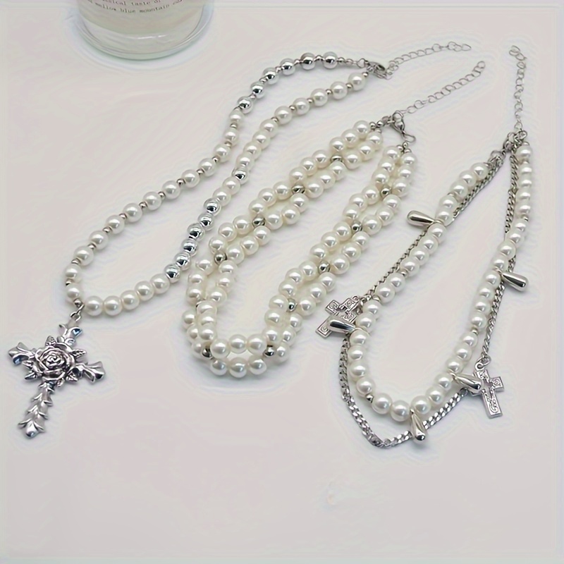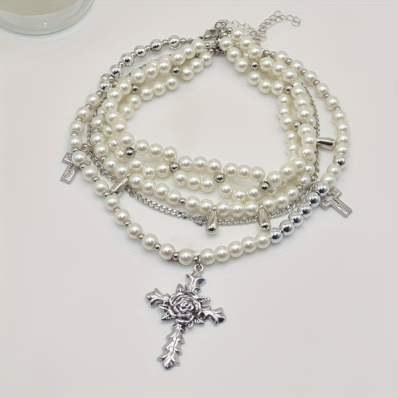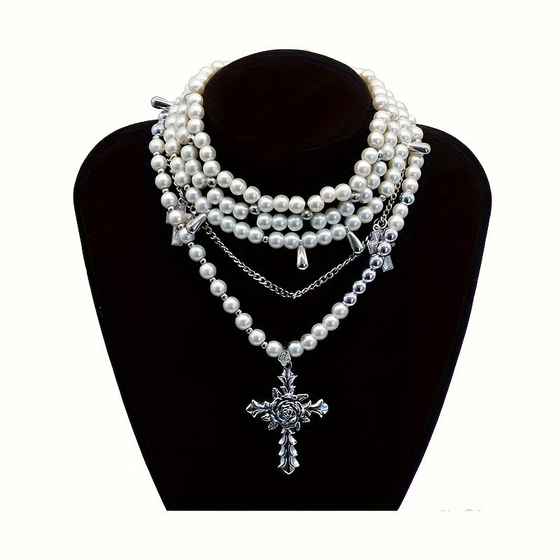 Saint Status Layered Pearl Necklace A multi-strand masterpiece crowned with a silver cross—equal parts sacred and savage.