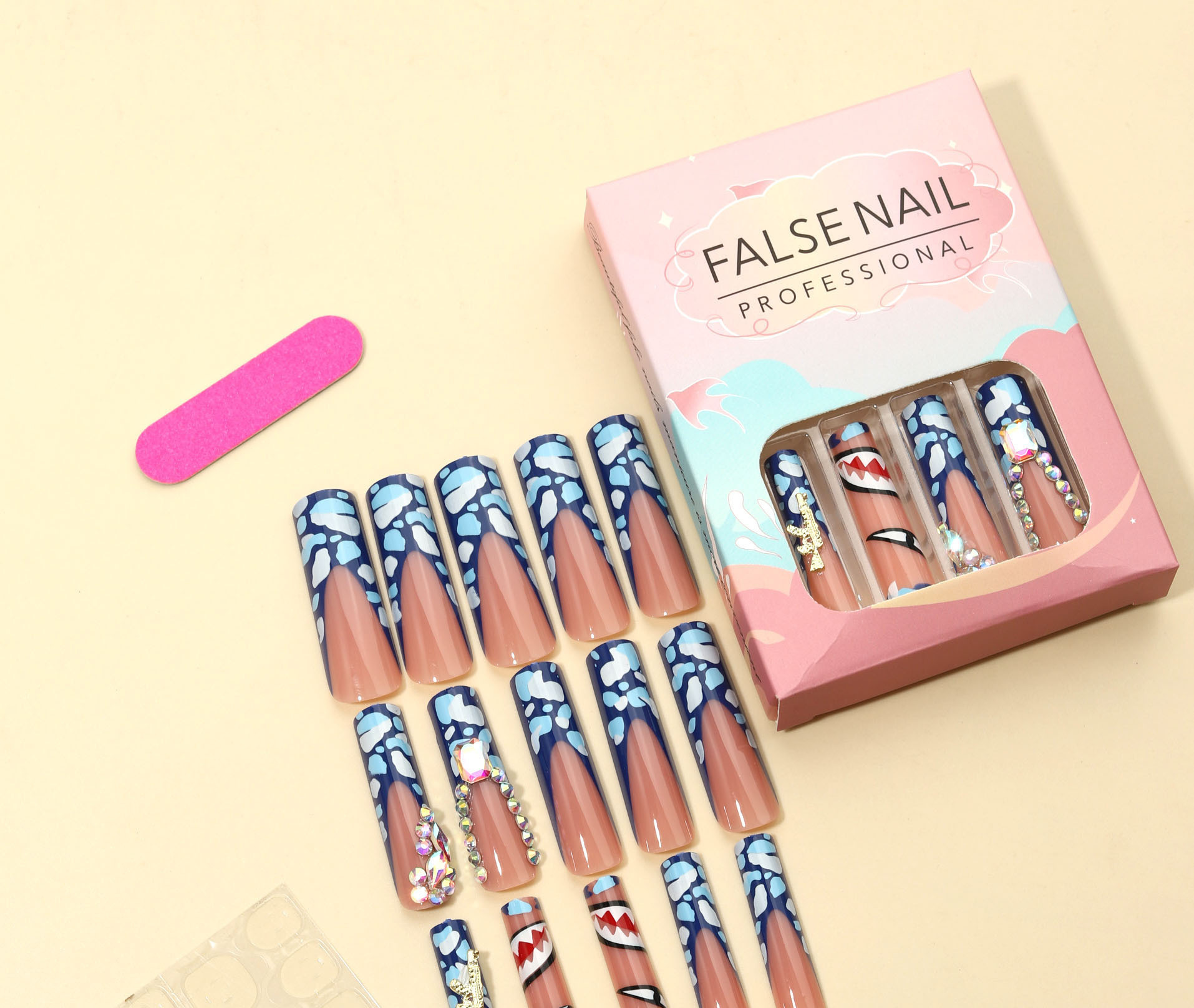 Statement. Savage. Sky-high shine. Bubblegum pink goes bad in a good way with this fierce shark design and floating cloud camo. Rhinestones drip like diamonds, and every nail hits like a sneaker drop. Perfect for streetwear shoots, glam drops, or any moment you want to serve bold beauty with bite. ✨ Glossy. Graphic. Game-changing. Add to cart and grab your sharks before they fly.