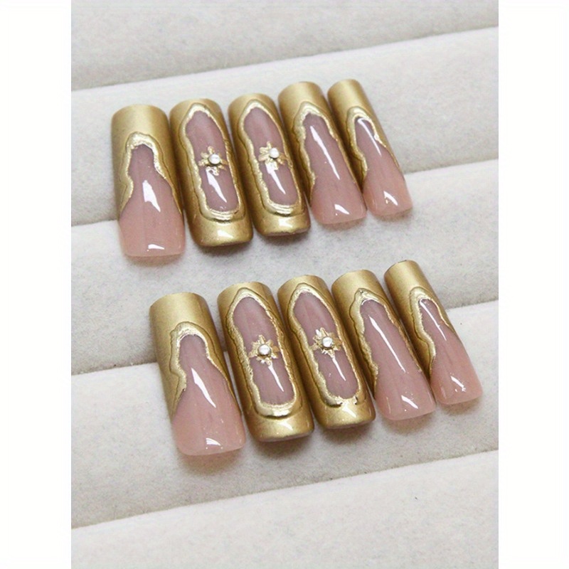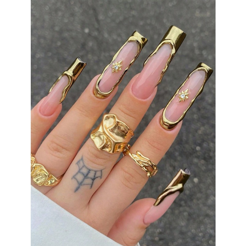 Framed in gold. Powered by pink. This handcrafted acrylic set features long, sculpted nails with a soft pink base, wrapped in metallic gold accents and crowned with star-shaped embellishments. Paired with bold rings and a spiderweb tattoo, this look is pure cosmic glam with street-style edge. Perfect for photo shoots, fashion moments, or any day you want to shine like you own the sky. ✨ Lightweight. Long-lasting. Luxe. Add to cart and get starstruck.