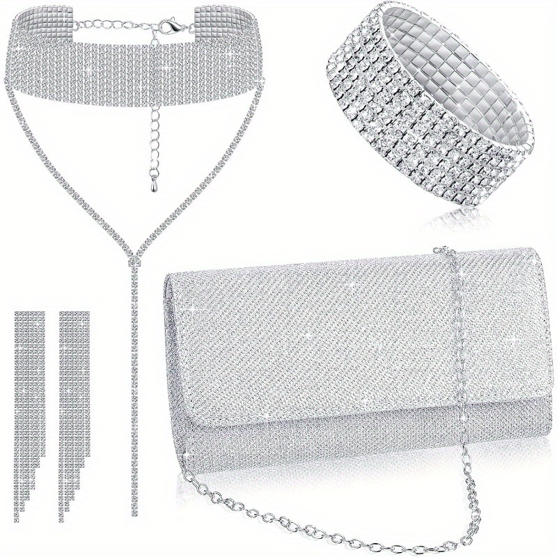 Heartbreak Hotel Necklace Set This set isn’t just jewelry—it’s a full glam entrance. “Heartbreak Hotel” features a rhinestone-encrusted choker with a dramatic Y-drop chain, matching waterfall earrings, a grid-pattern cuff bracelet, and a glitter clutch that catches every light in the room. Whether you’re stepping into a gala or turning heartbreak into high fashion, this set delivers unapologetic sparkle and main character energy.