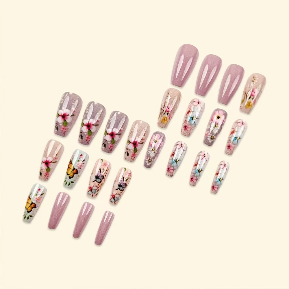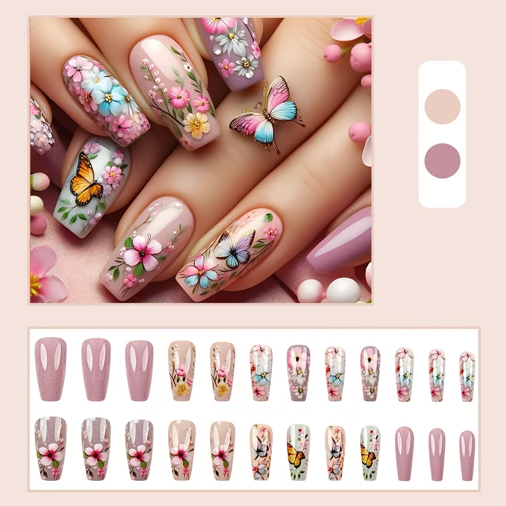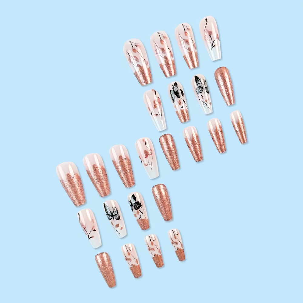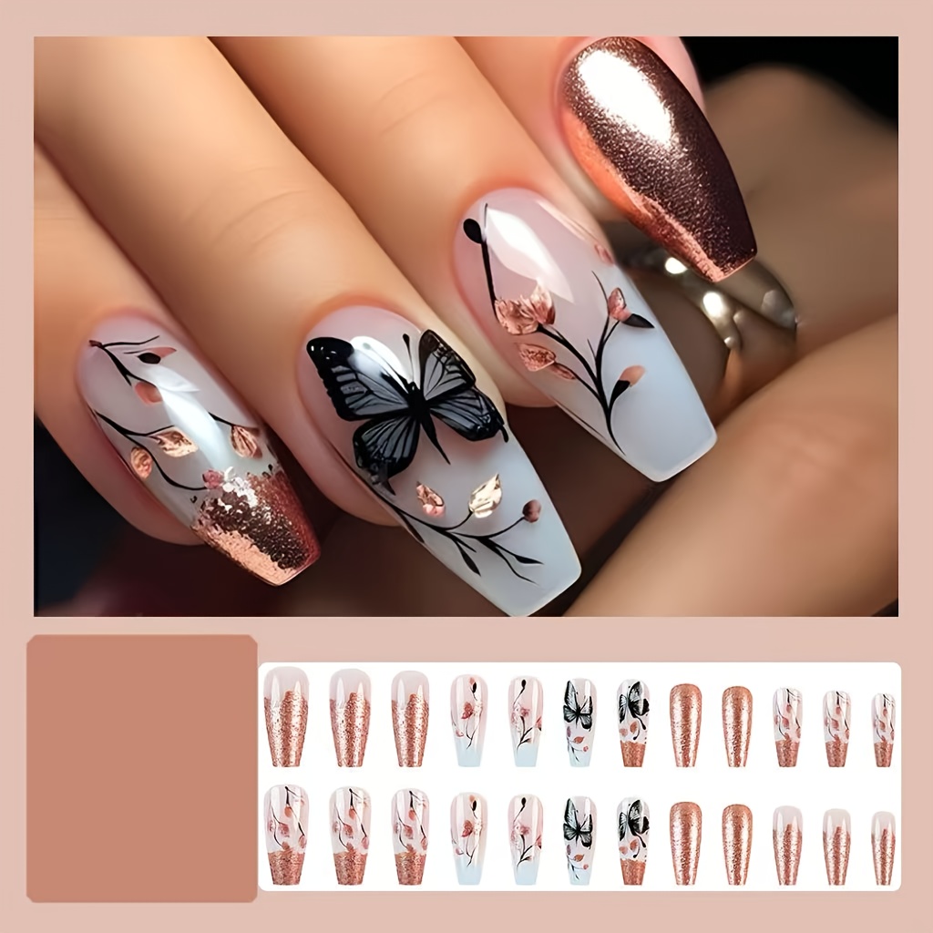 Breathtaking. Artistic. Feminine. The Butterfly Breeze Nail Set is where ethereal beauty meets high-fashion detail. Metallic rose gold meets translucent ombré, while black butterflies and floral motifs flutter across each nail like wearable poetry. This set isn’t just pretty—it’s powerfully soft, romantically bold, and designed to mesmerize.