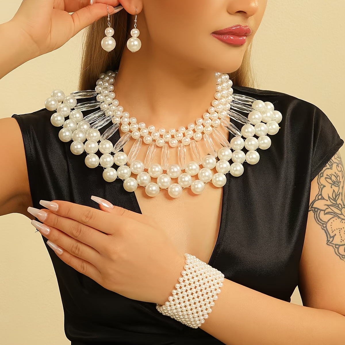 Step into your spotlight. “Couture Halo” is a layered pearl fantasy designed to frame your glow in unapologetic luxury. With cascading strands and matching drop earrings, this set delivers red carpet energy with every glance.