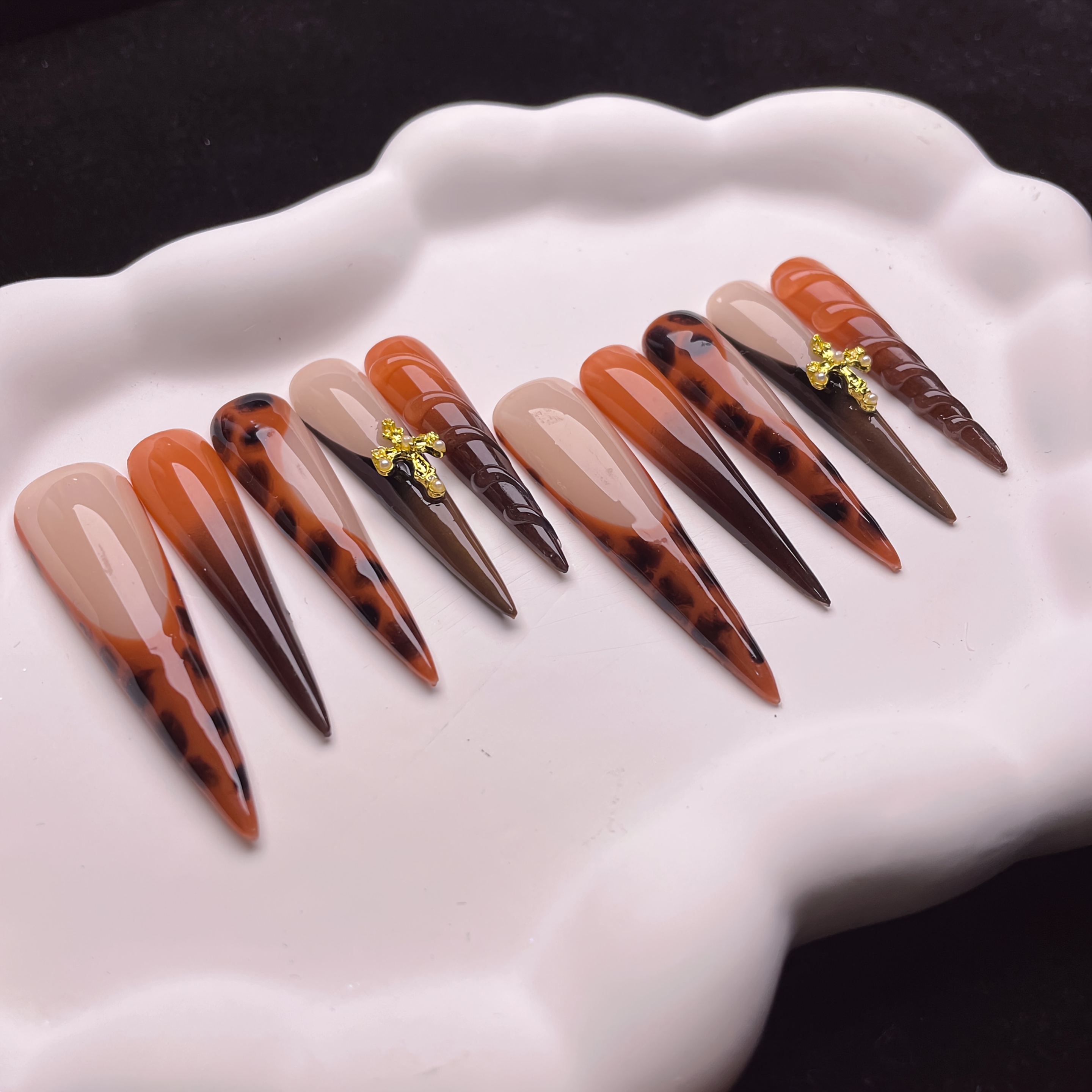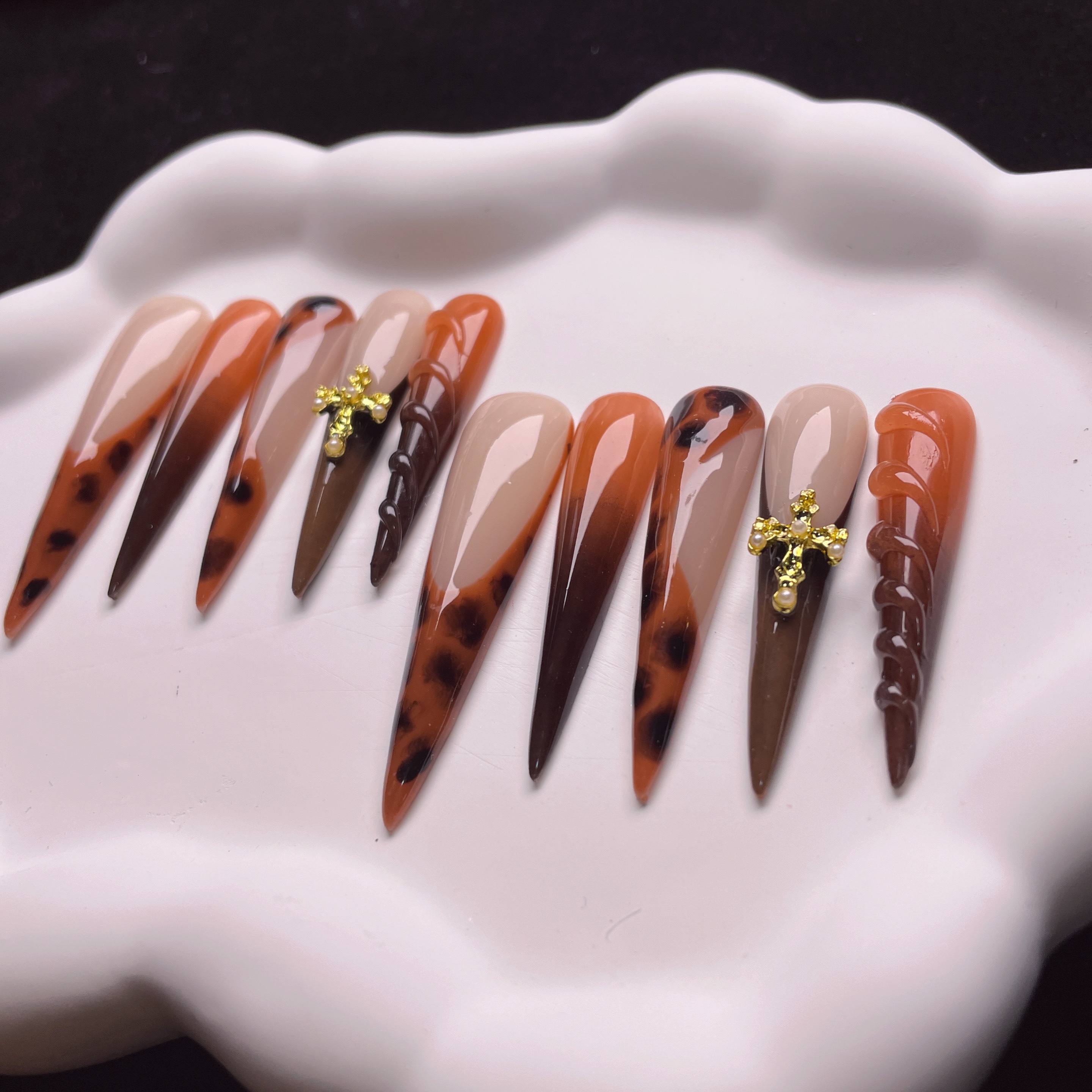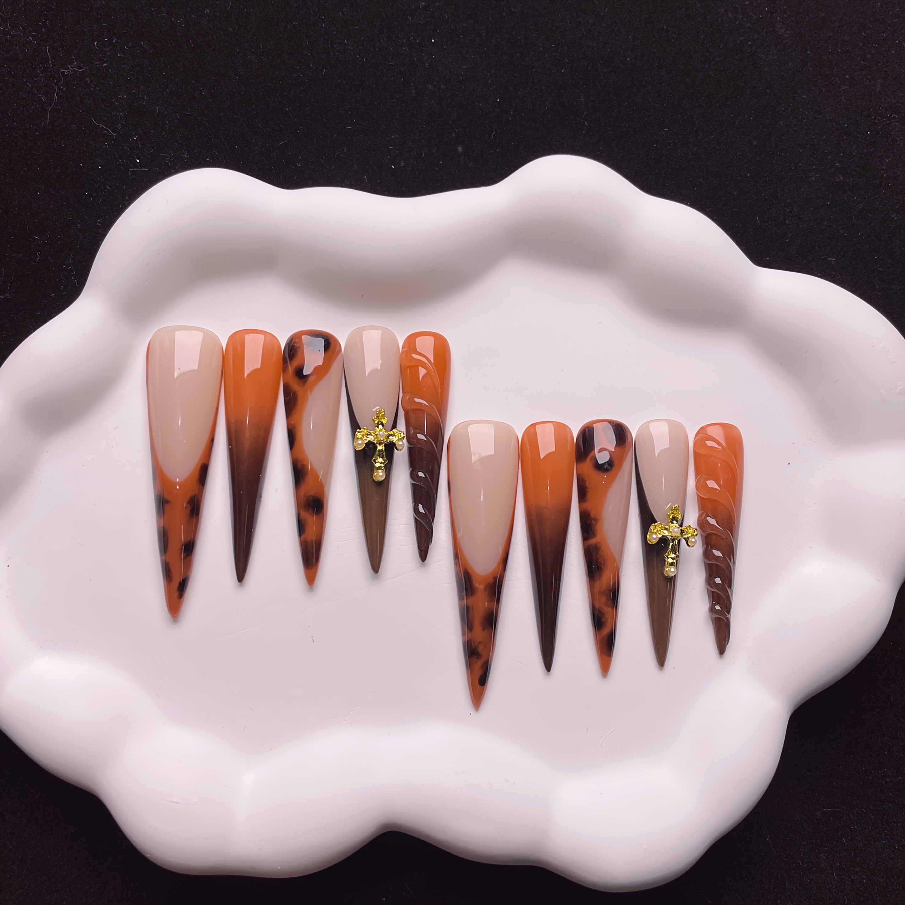 Python-printed flame tips on a glossy nude base add a hint of gold for a high-heat glow. This handcrafted stiletto set blends animal instinct with divine detail—leopard print, molten orange gradients, and a rhinestone cross that hits like a blessing. Perfect for glam drops, editorial shoots, or any moment you want to serve heat with holiness. ✨ Bold. Burnt. Blessed. Add to cart and spark your style now.