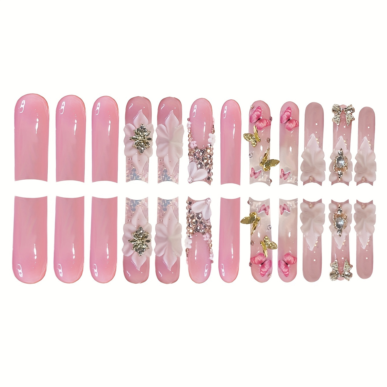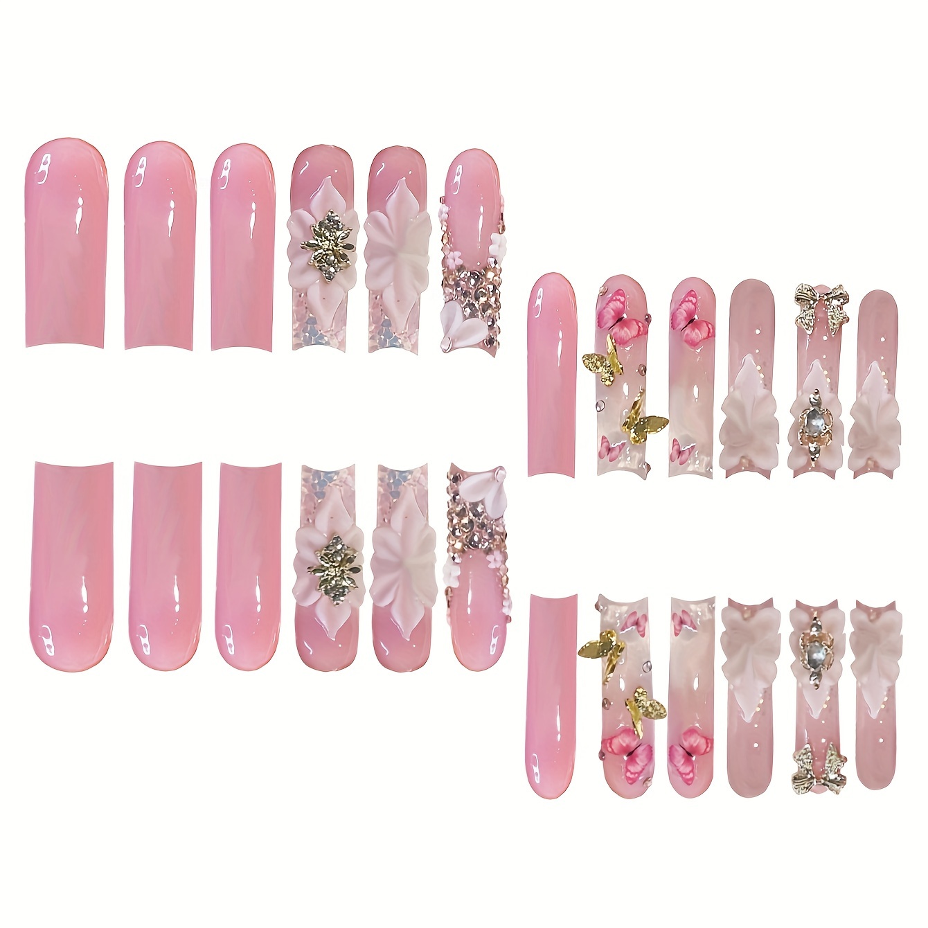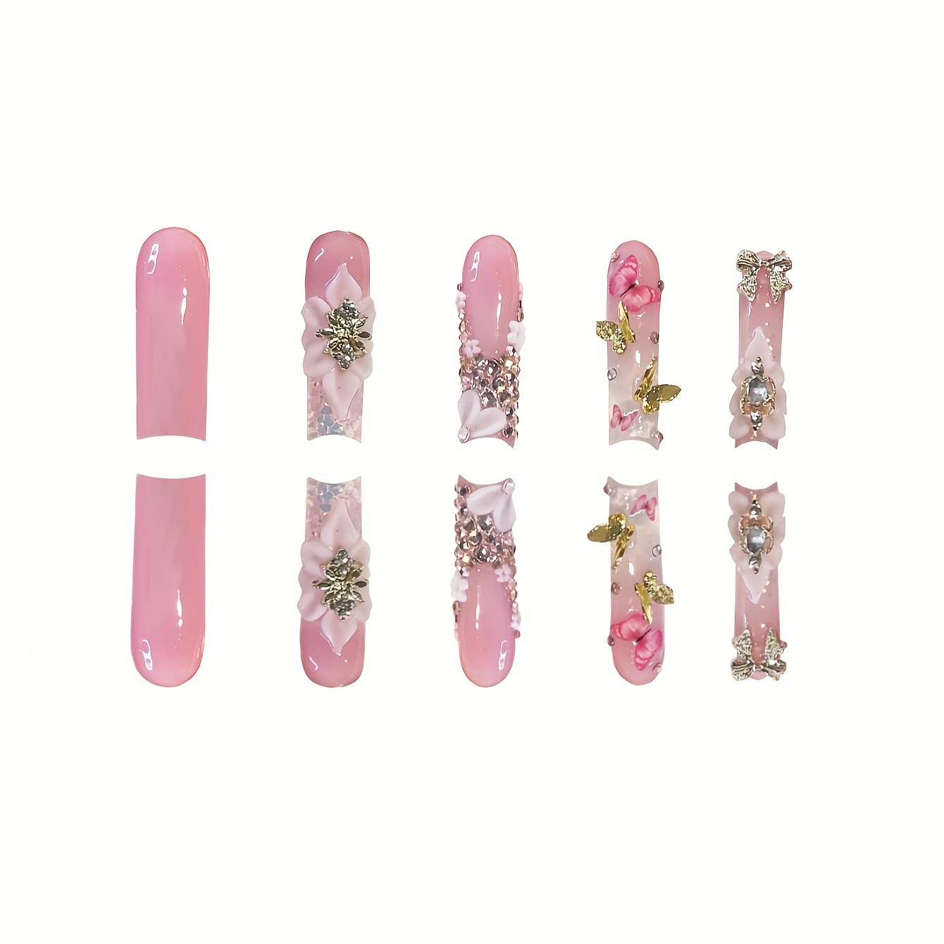 Butterflies. Blossoms. Bling fit for a throne. This handcrafted set is a royal glam fantasy—soft pink tips layered with 3D florals, crystal butterflies, gold bows, and rhinestones that shimmer like heirlooms. Every nail is a crown jewel. Perfect for glam drops, bridal slay, or any moment you want to serve dynasty-level dominance.