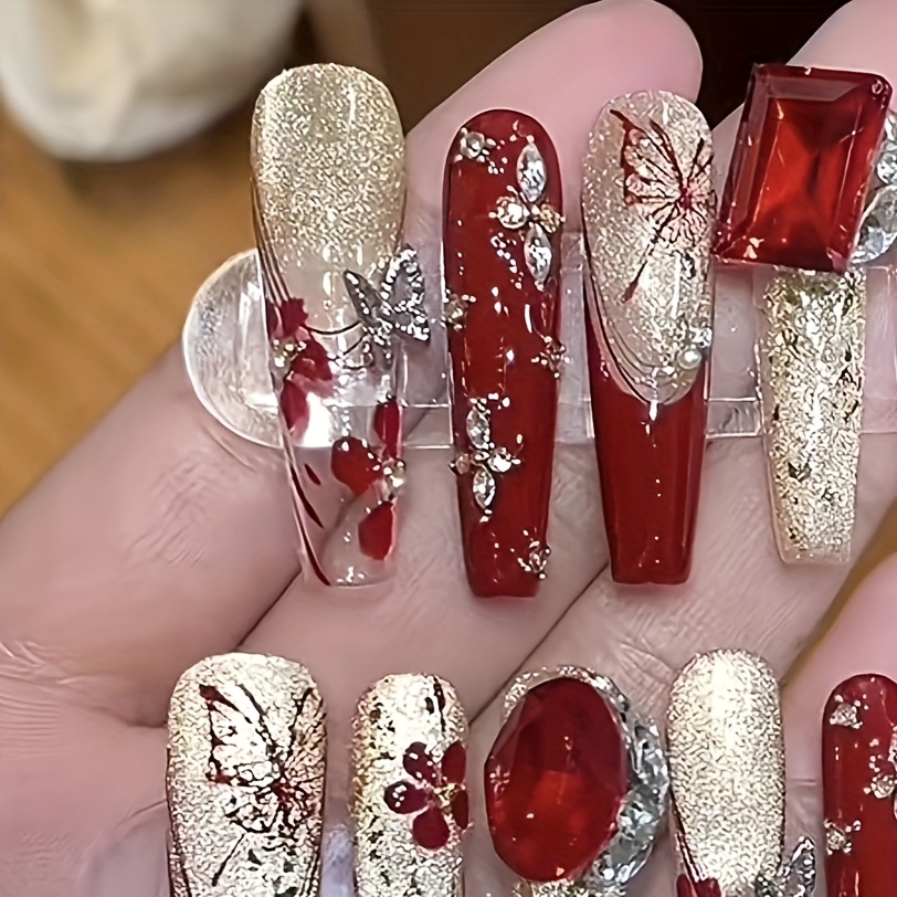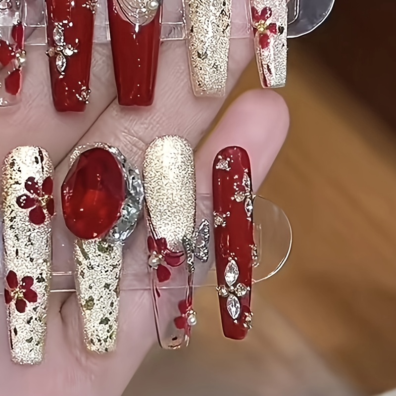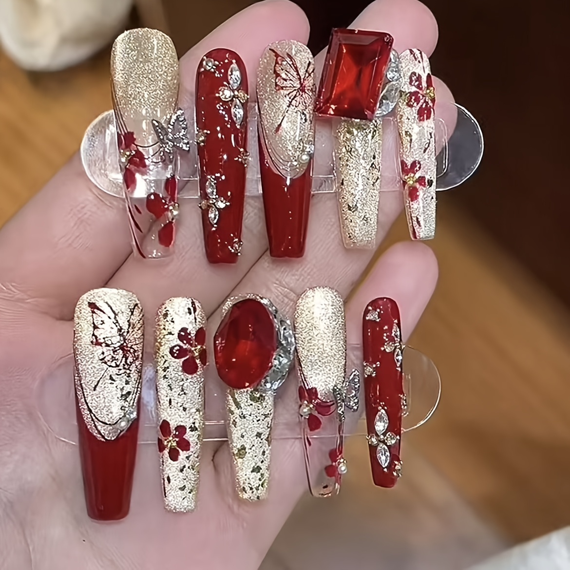 Snowflakes. Gift boxes. Glittering gold. This handcrafted holiday set is a timeless glam tradition—rich red paired with sparkling gold, wrapped in festive embellishments like snowflakes, rhinestones, and ribboned gift art. Perfect for glam drops, holiday parties, or any moment you want to serve Christmas couture.