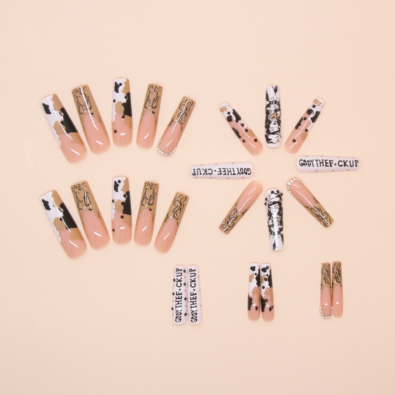 Bold. Illustrated. Unapologetically loud. This handcrafted acrylic set blends Western edge with street-style attitude—featuring sculpted nails in beige, black, and white, layered with rhinestones, paisley prints, and custom illustrations. From the “GODYTHEFCKUP” star-stamped slogan to the cowgirl art and abstract detailing, every nail is a wearable canvas of rebellion and glam. ✨ Long-lasting. Lightweight. Limitless. Add to cart and giddy the fck up.