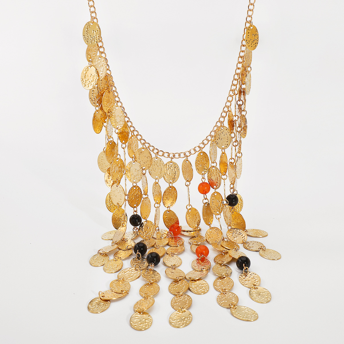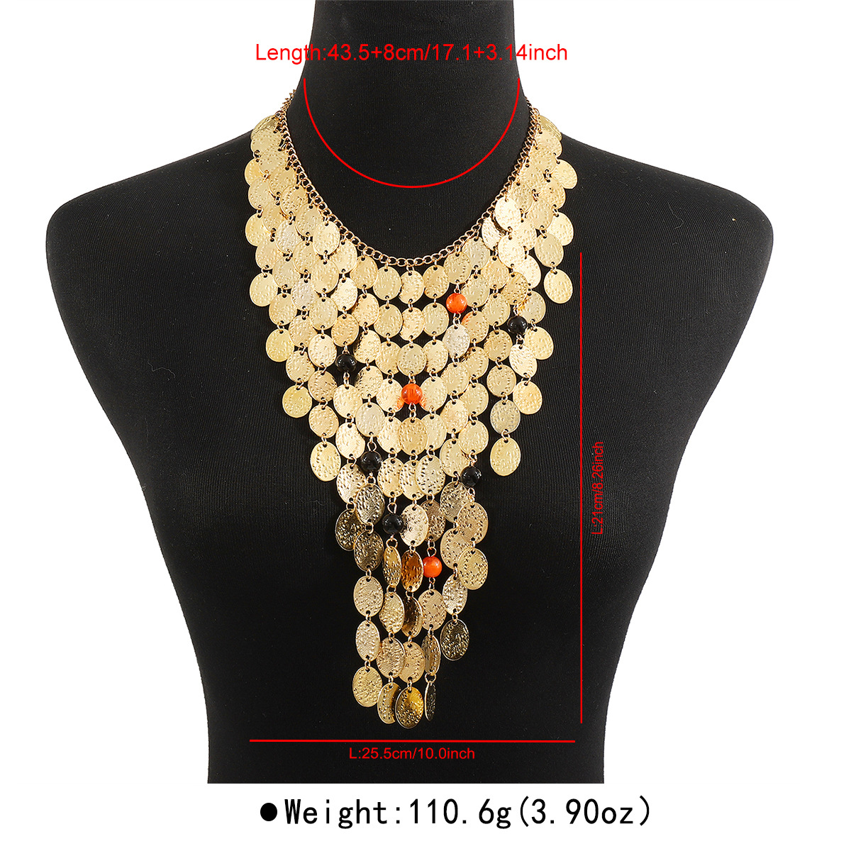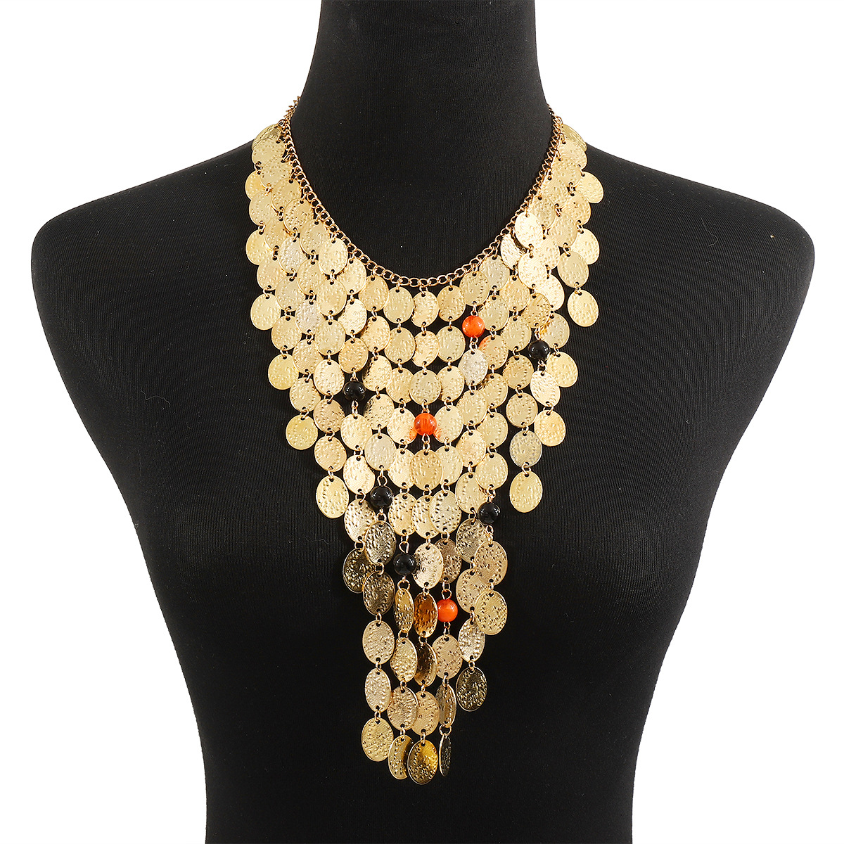 Coin Fringe – Layered Statement Jewelry Gold shimmer. Tribal rhythm. Neckline domination. This handcrafted necklace is a full-on glam cascade—layered coin discs that catch the light with every move, accented by warm amber beads for a touch of earthy opulence. Whether you’re styling a shoot, stepping into ceremony, or just claiming your spotlight, this piece delivers instant icon energy.