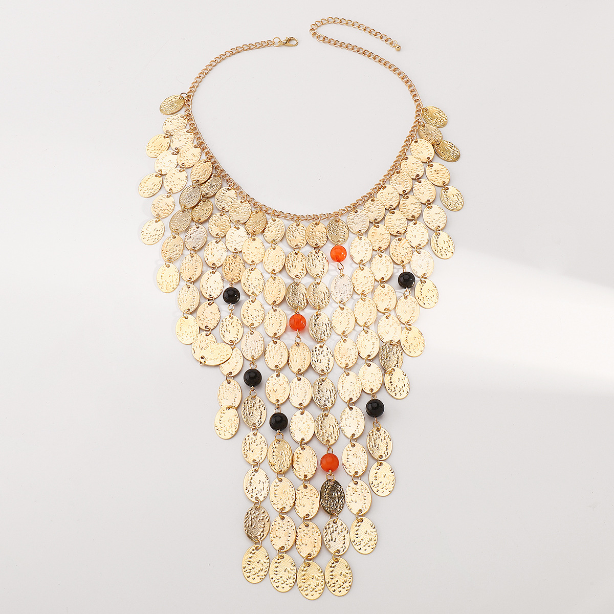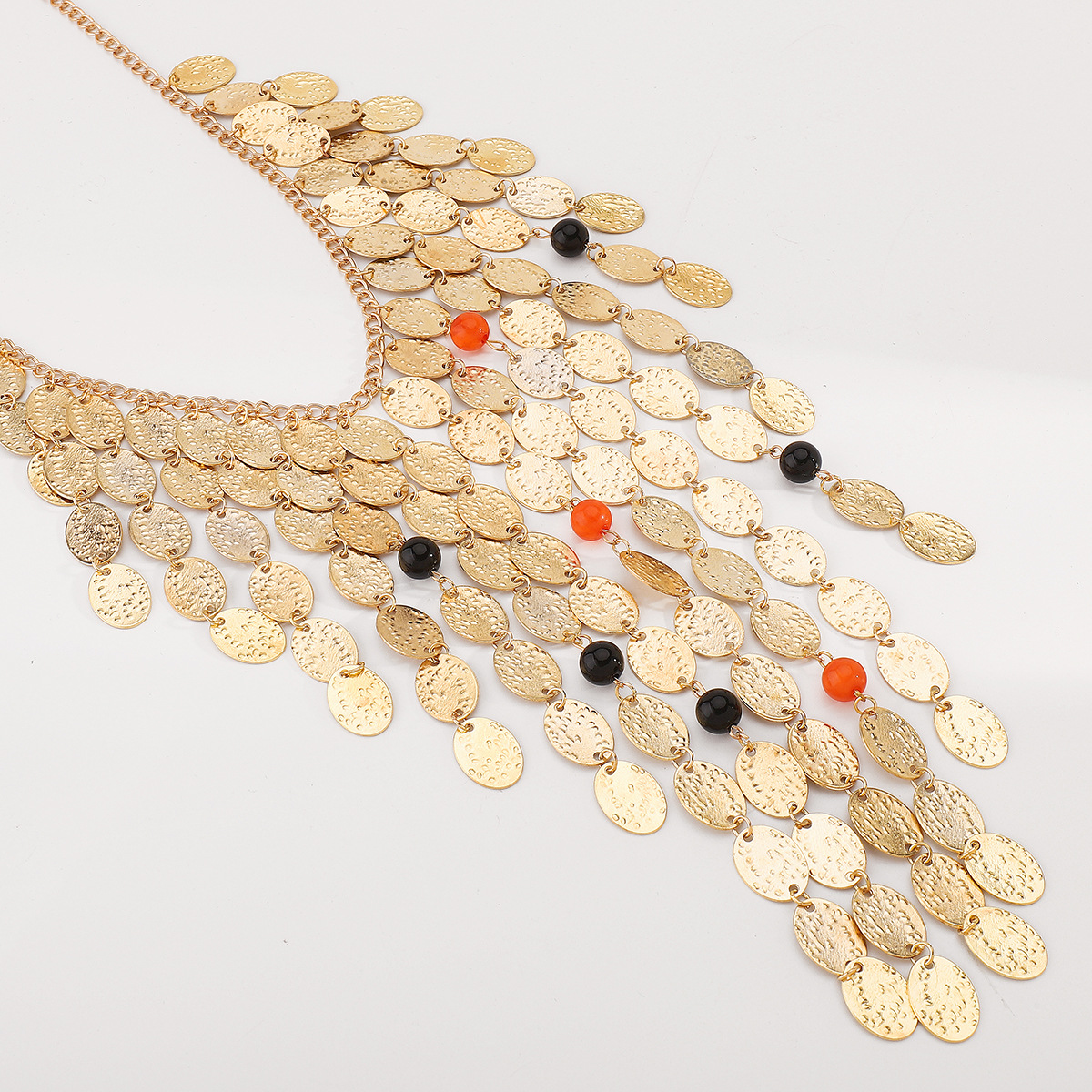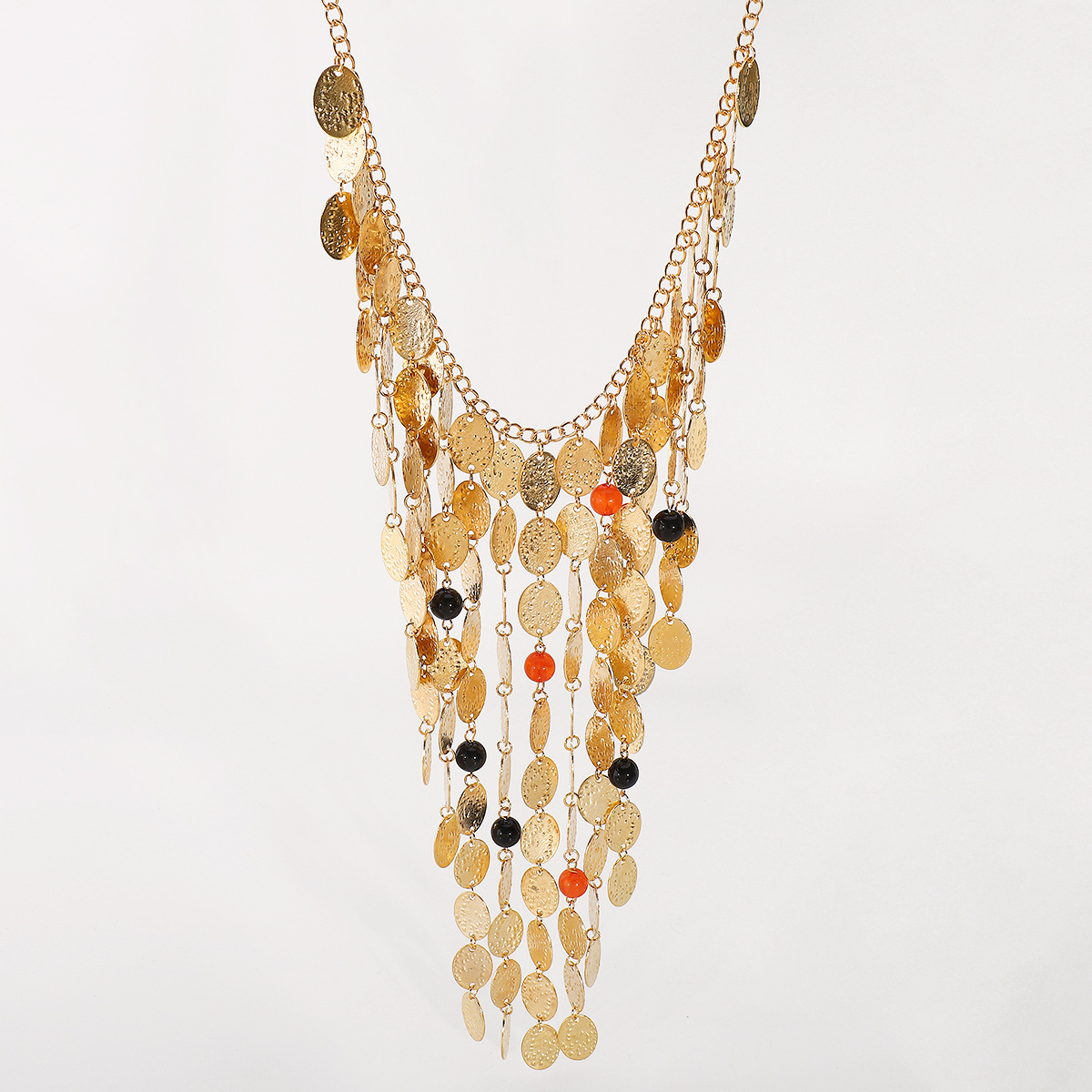 Coin Fringe – Layered Statement Jewelry Gold shimmer. Tribal rhythm. Neckline domination. This handcrafted necklace is a full-on glam cascade—layered coin discs that catch the light with every move, accented by warm amber beads for a touch of earthy opulence. Whether you’re styling a shoot, stepping into ceremony, or just claiming your spotlight, this piece delivers instant icon energy.